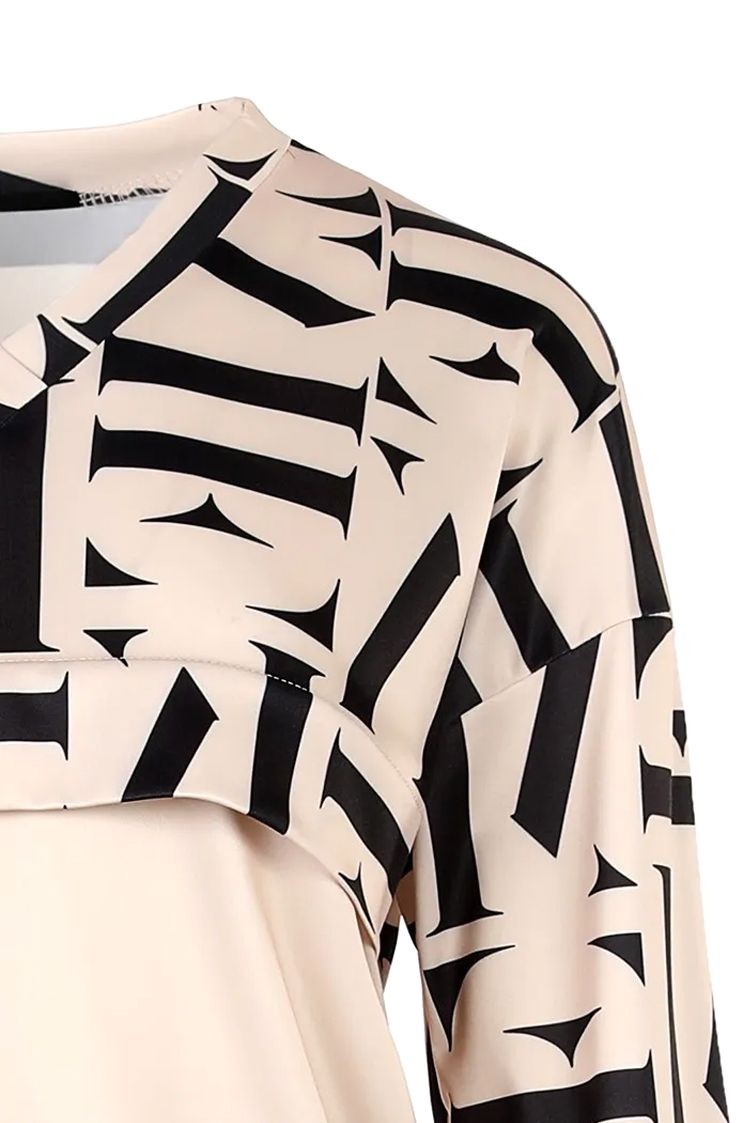 - Bluza ima duge rukave sa lastišem na krajevima i trouglastim dekolteom, a pantalone su visokog struka i udobnog kroja.