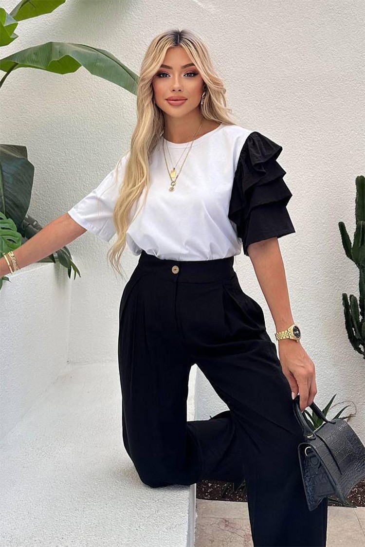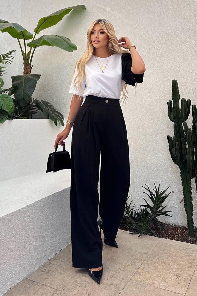 - Kombinacija prozračnih pantalona visokog struka i bluze sa akcentnim rukavom stvara izgled koji je istovremeno minimalistički i nezaboravan. Silueta ističe ženstvenost na prirodan i nenametljiv način.