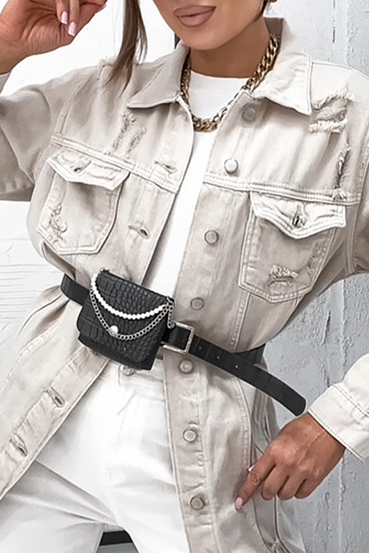 - Moderna teksas jakna sa efektnim kaišem od eko kože, pogodna za svaki izgled.