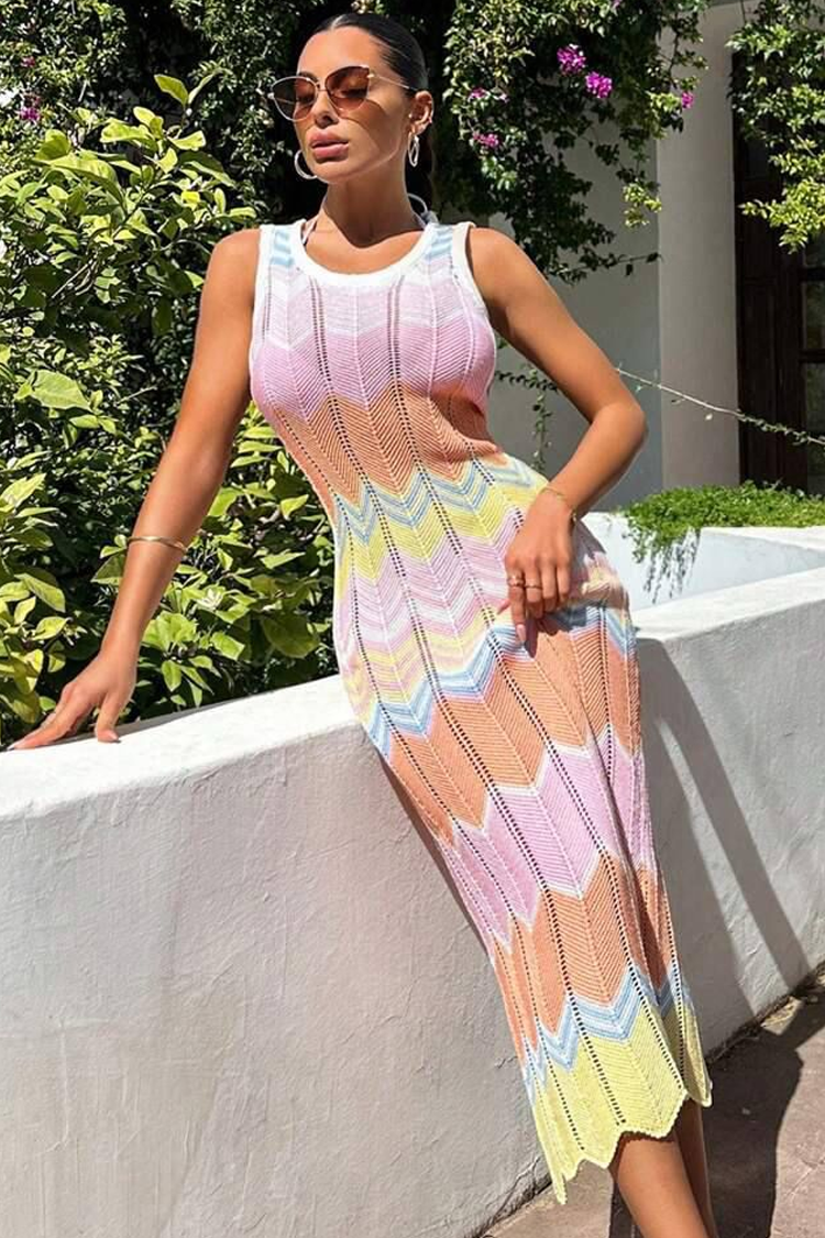 - Budite moderni uz ovu midi haljinu sa višebojnim dizajnom, pogodnu za letnje dane pored mora.