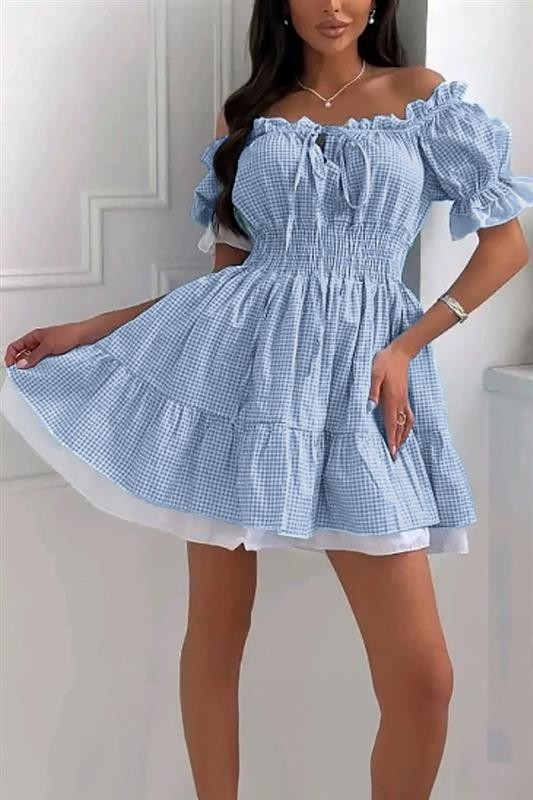 • Kratka haljina sa trendi dizajnom u višebojnom dezenu, pogodna za razne modne kombinacije.