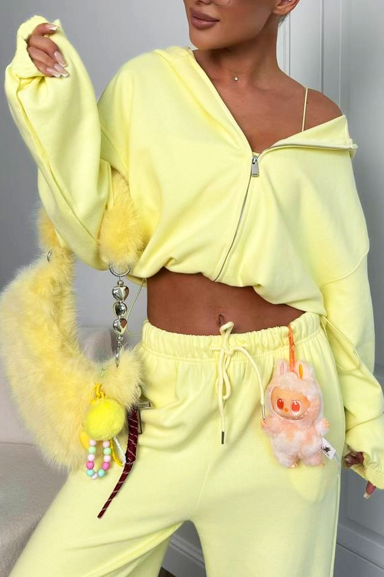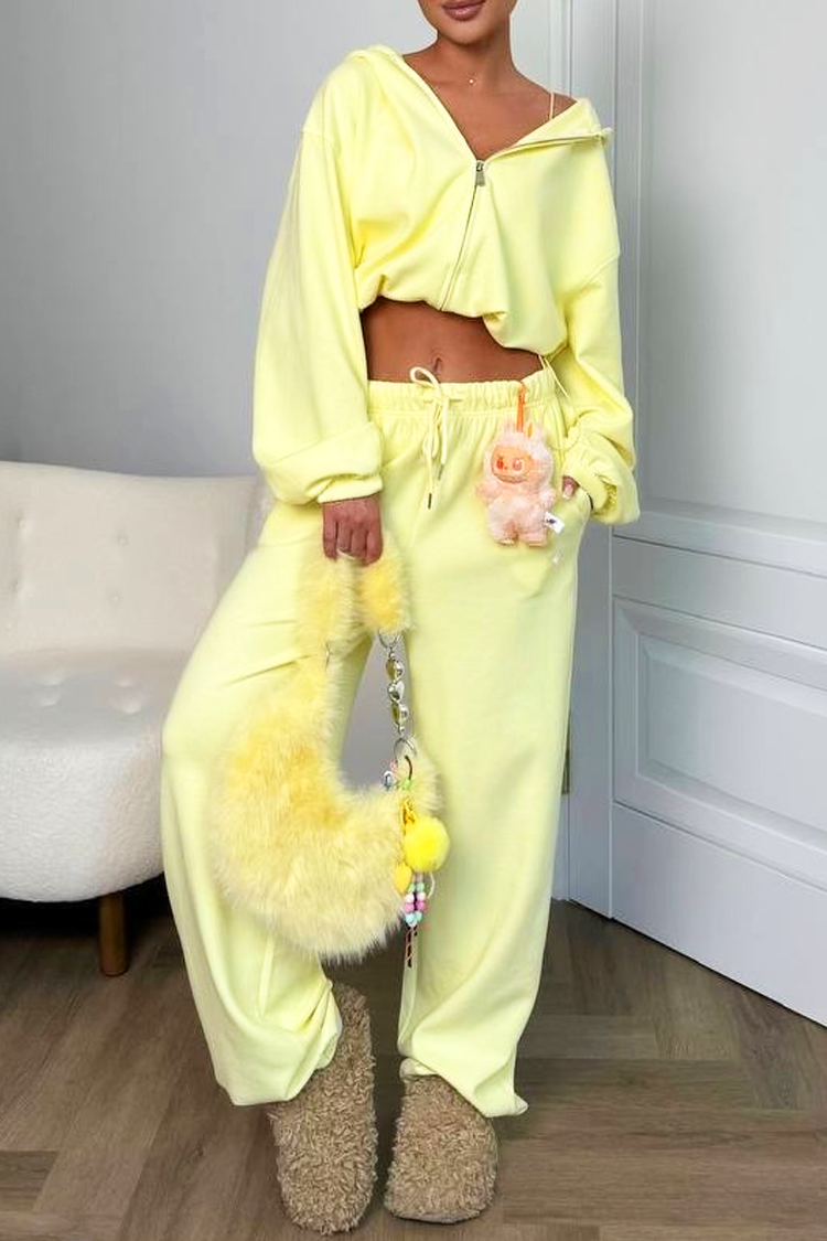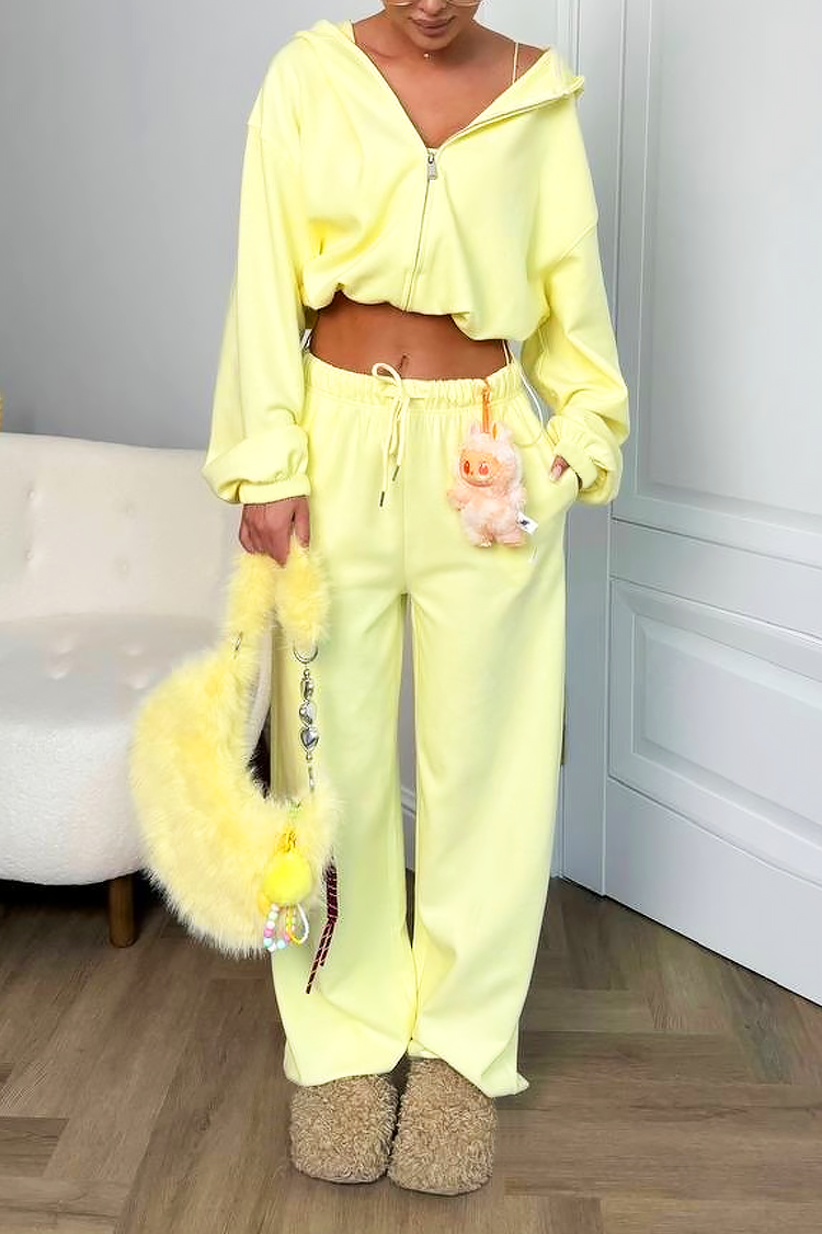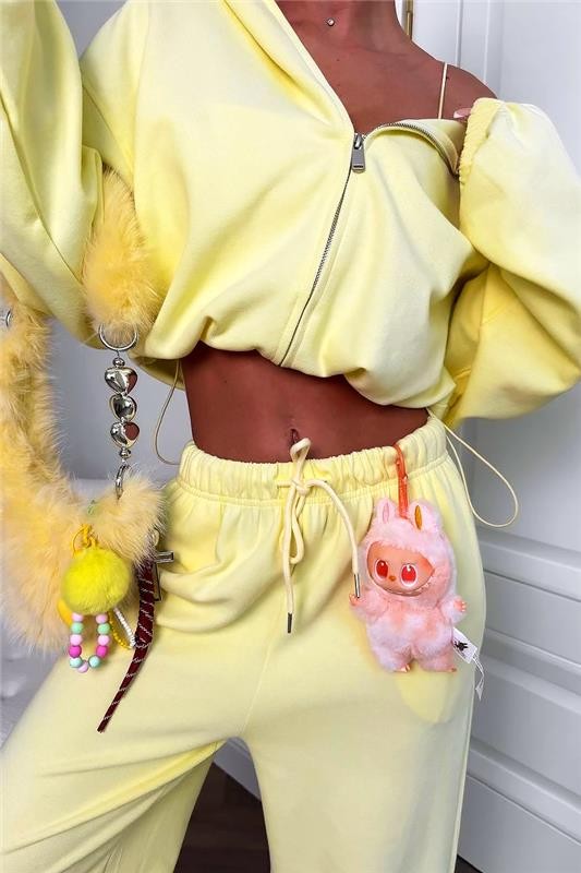 - Kratka dukserica sa kapuljačom, kombinovana sa pantalonama sa visokim elastičnim strukom i zvonastim krojem za moderan izgled.