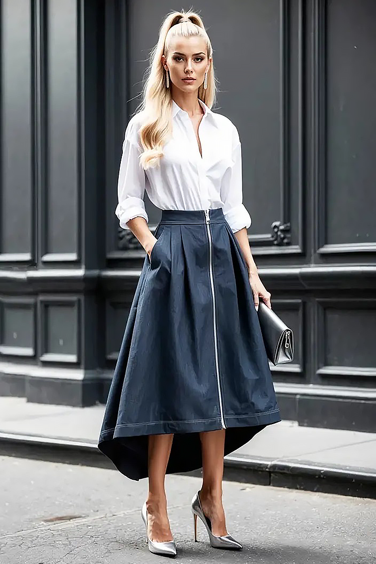 - Suknja ima asimetričnu dužinu, visok elastični struk i rajsferšlus na prednjoj strani.