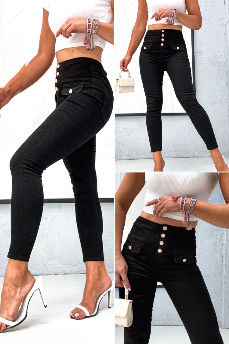 - Model ima visok struk, uski kroj i efektnu dugmad na prednjoj strani.