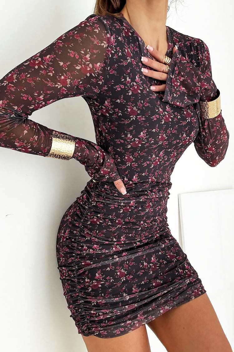 - Haljina ima uski kroj, duge rukave i cvetne motive.