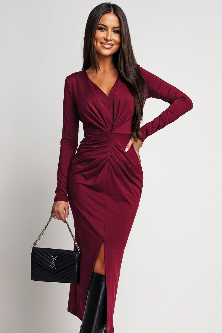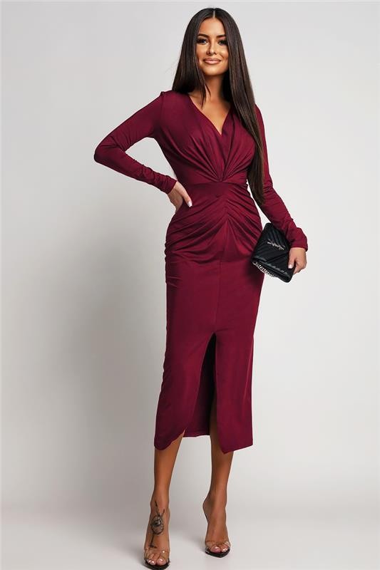- Haljina ima duge rukave, uski kroj i V-izrezan dekolte sa efektnim naborima i šlicem.