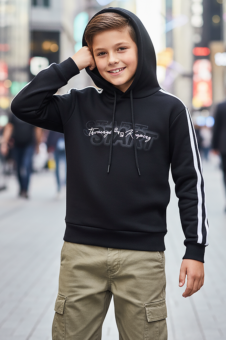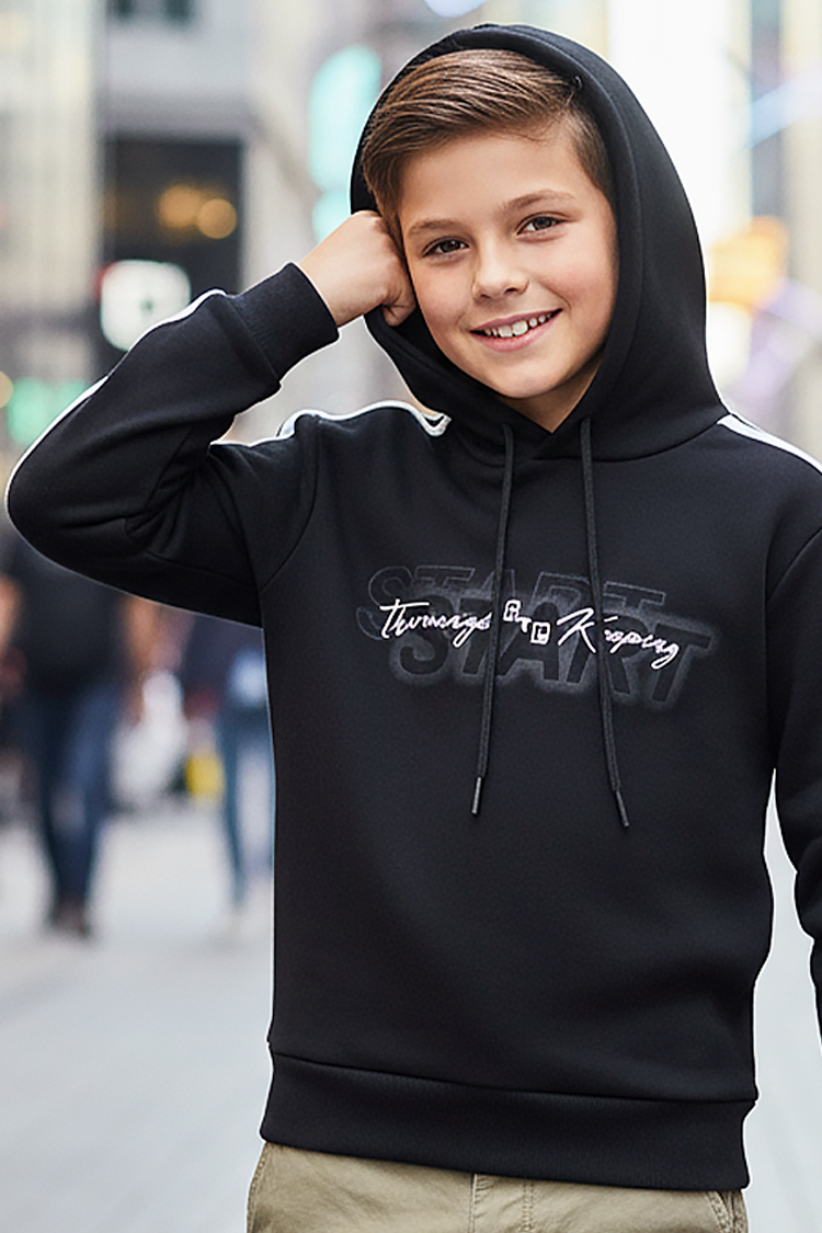 • Dečija dukserica sa modernim dizajnom, kapuljačom, efektnim natpisom i dugim rukavima.