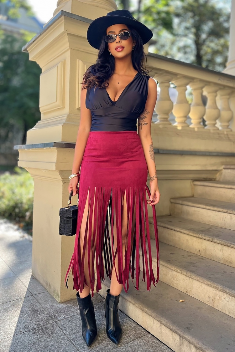 - Moderna midi suknja sa seksi dizajnom izrađena od eko velura, pogodna za svakodnevni trendi izgled.