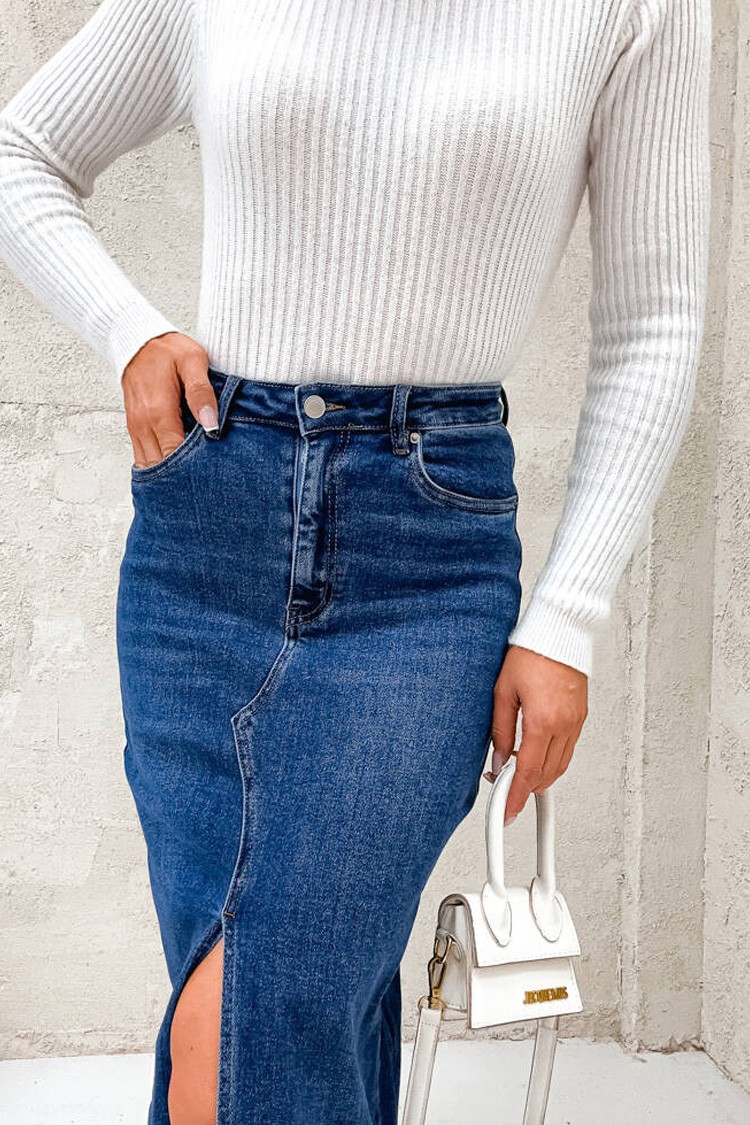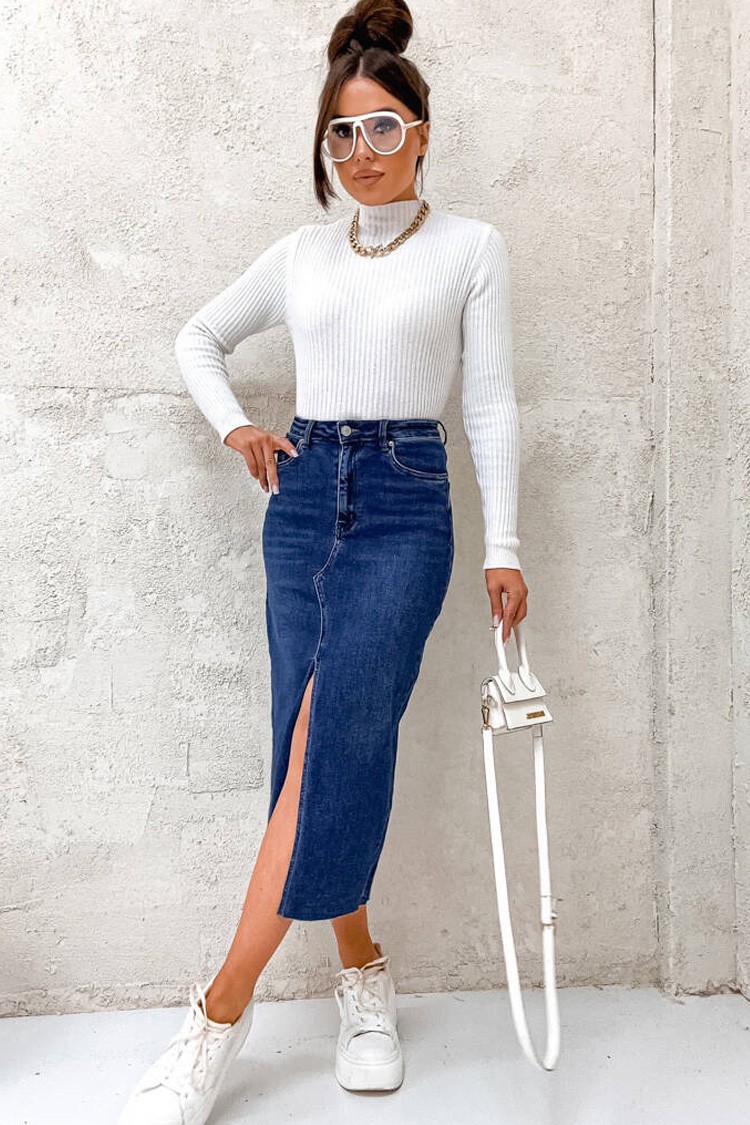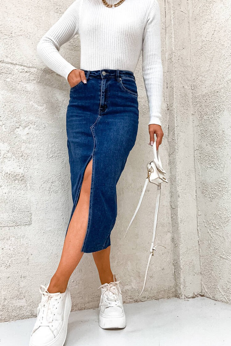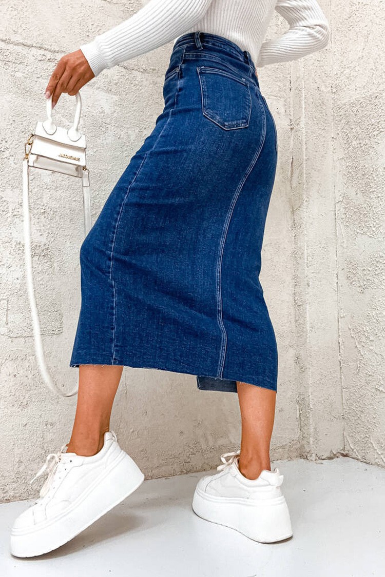 - Za vaš trendi izgled, izaberite ovu teksas midi suknju, pogodnu za razne modne kombinacije.