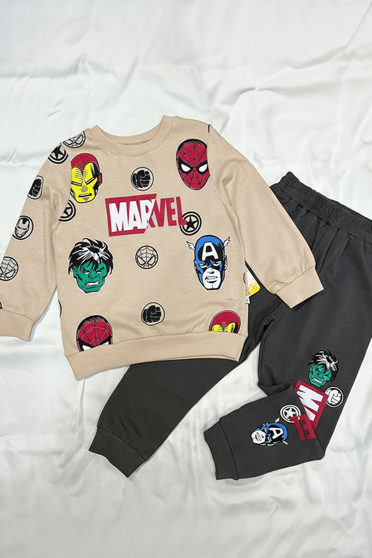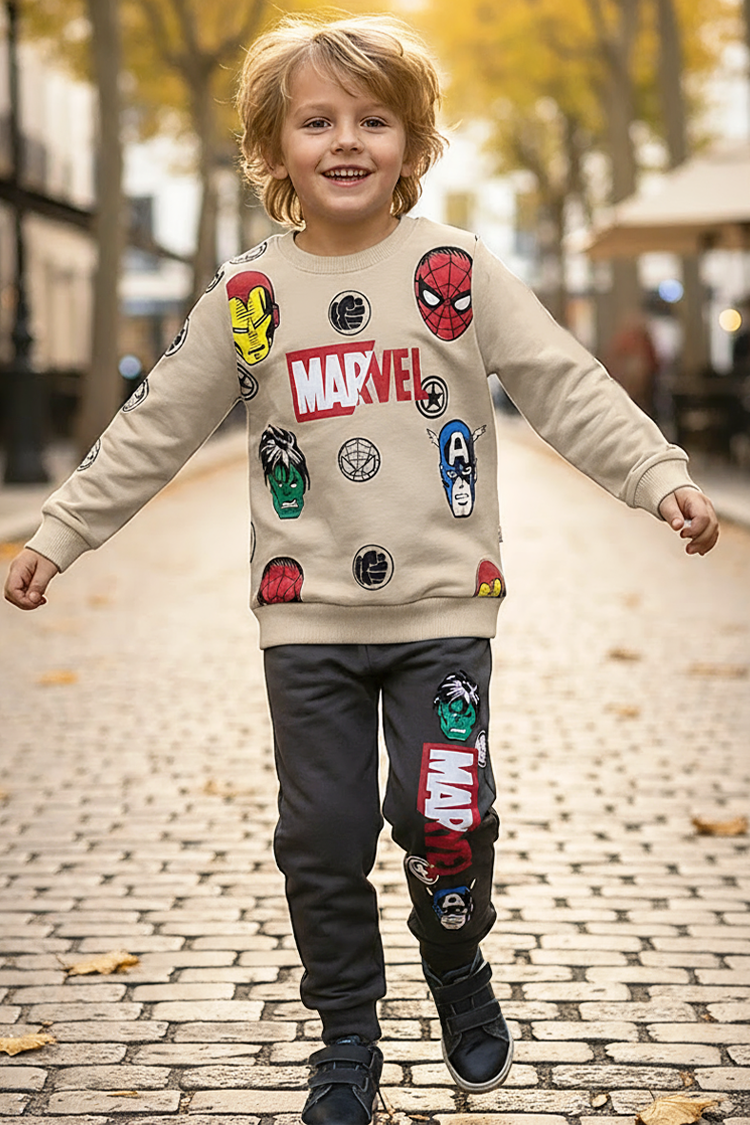 - Gornji deo ima duge rukave i Marvelov print, a pantalone imaju visok i elastičan struk.