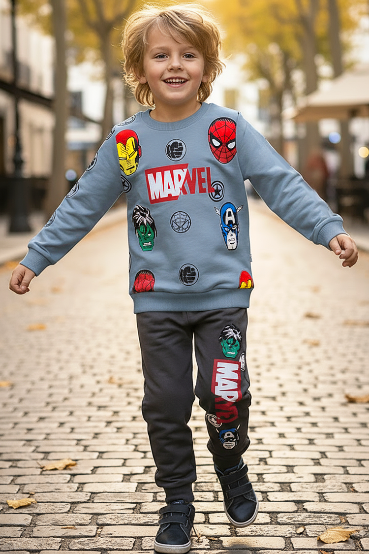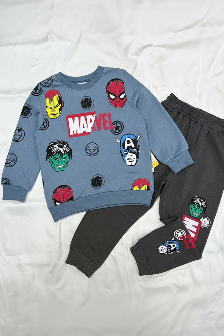 - Gornji deo ima duge rukave i Marvelov print, a pantalone imaju visok i elastičan struk.