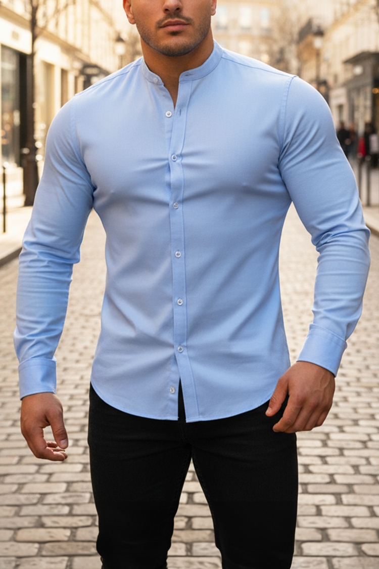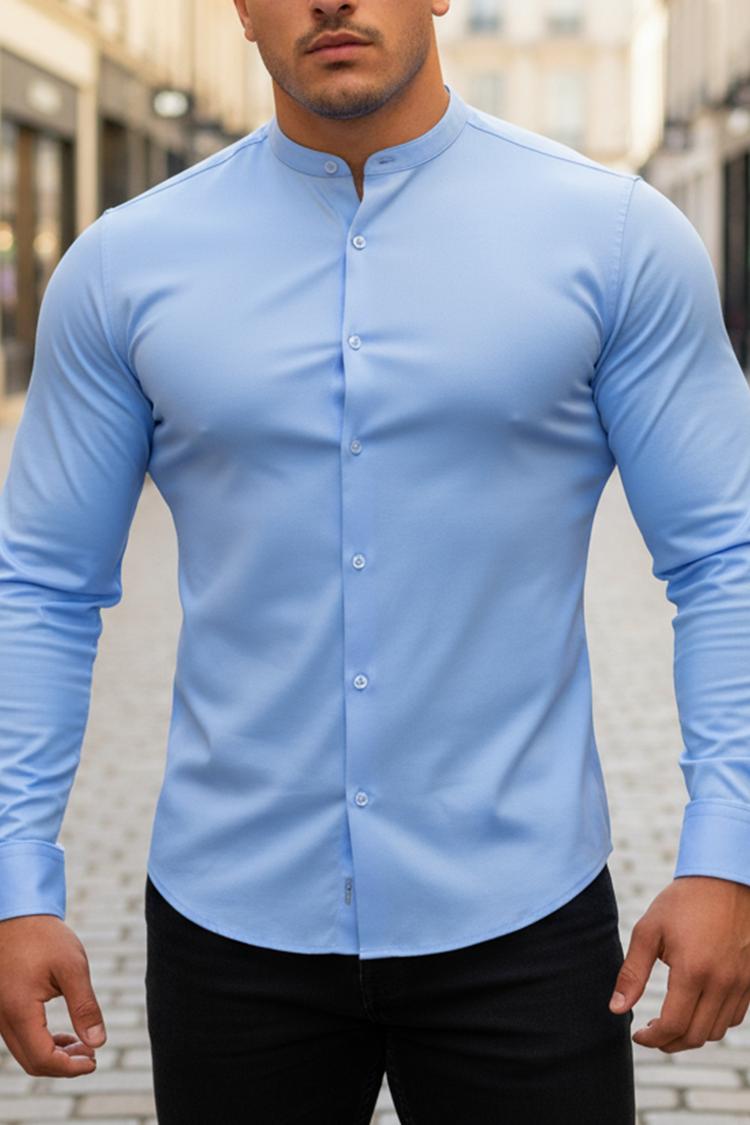 - Elegantna muška košulja klasičnog dizajna u svetlo plavoj boji, pogodna za razne modne kombinacije.