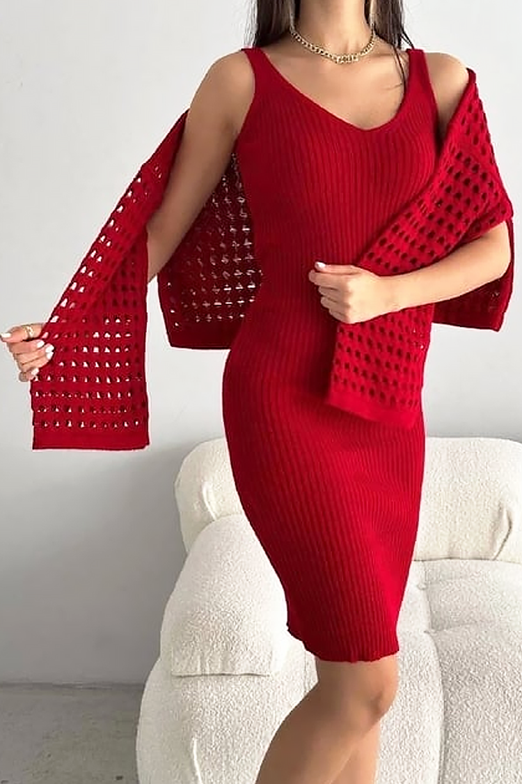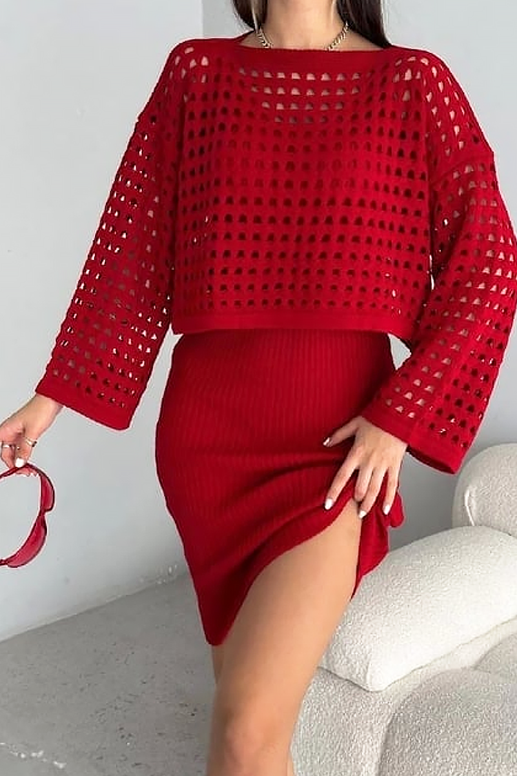 • Ženski dvodelni komplet, koji se sastoji od kratke haljine i efektnog džempera, pogodan za trendi izgled.
