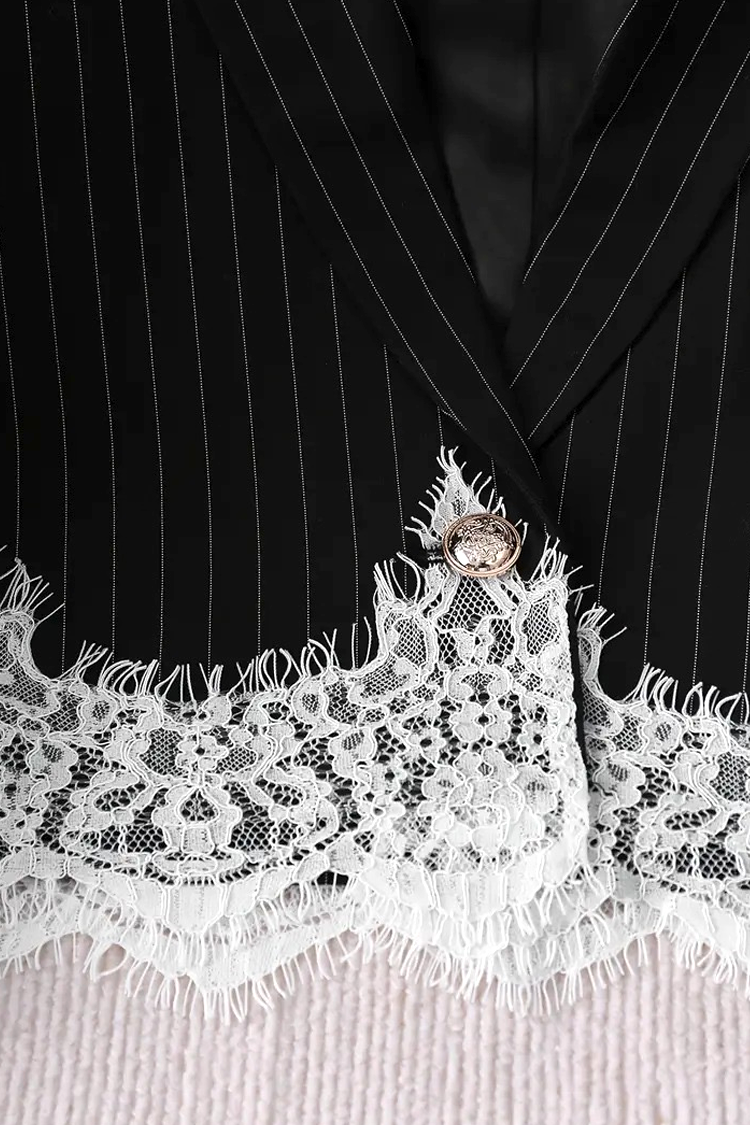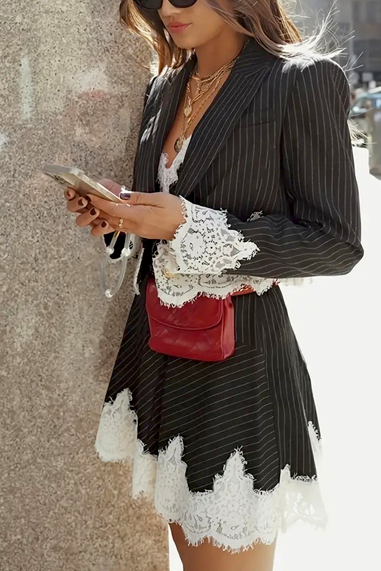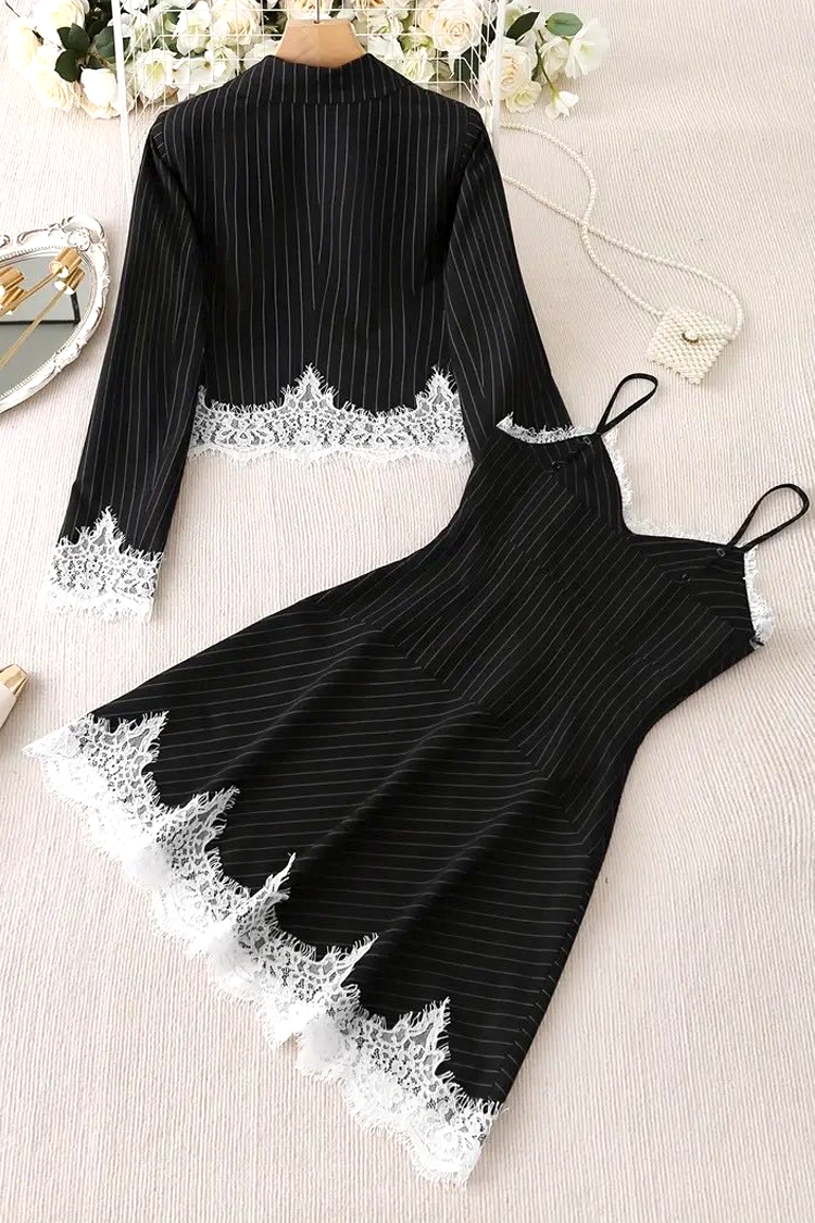 • Atraktivan dvodelni komplet koji se sastoji od haljine i sakoa sa čipkom i prugastim dezenom.