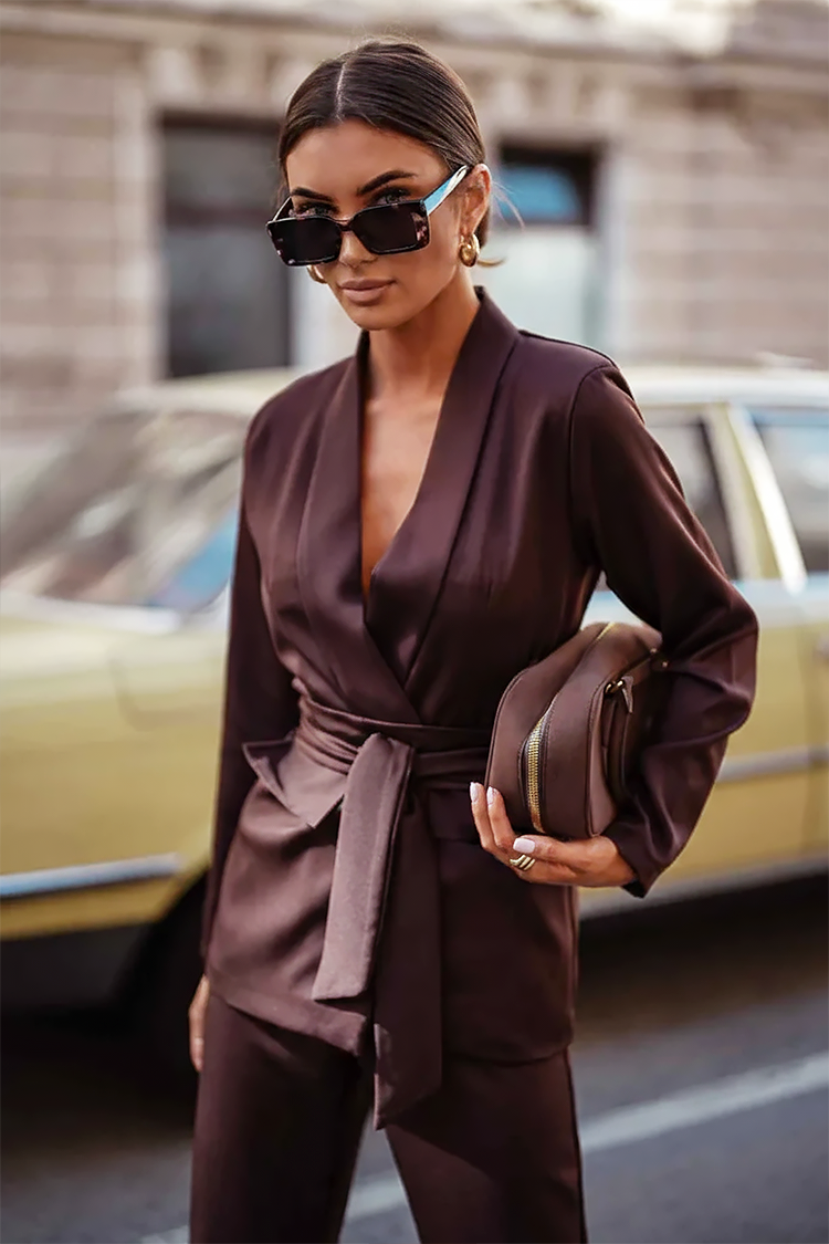 • Pantalone imaju visok struk i široke nogavice, a sako ima elegantan dizajn, kragnu i kaiš.