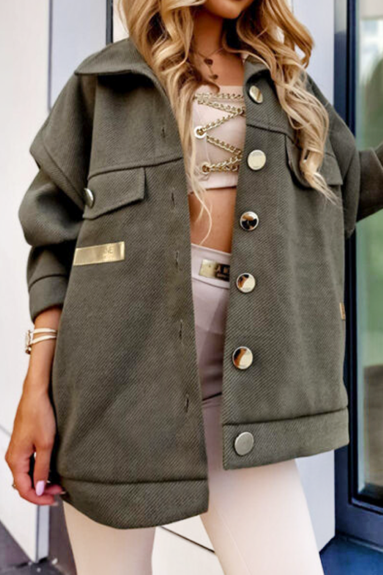- Model ima slobodan kroj i dugmad duž prednje strane.