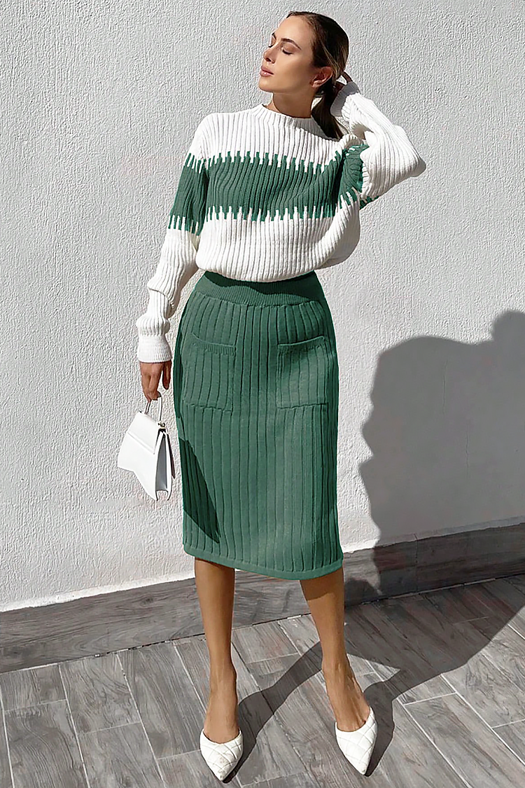 • Suknja je midi veličine, sa udobnim krojem i visokim strukom, a džemper ima udoban i oversize dizajn.