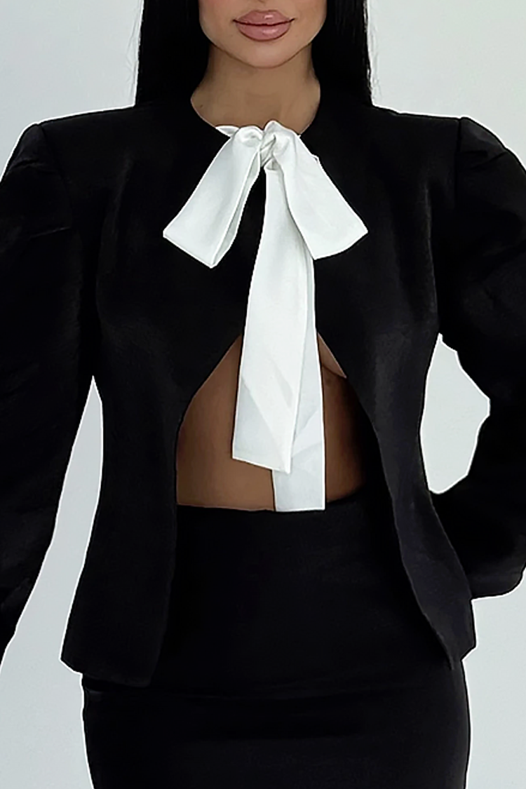 - Bluza ima elegantan dizajn, duge rukave i akcentnu mašnu na prednjoj strani, a suknja ima uski seksi kroj.