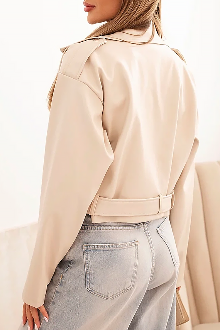 - Model ima udoban kroj, stilsku kragnu, zatvaranje na rajsferšlus i kaiš od iste tkanine.