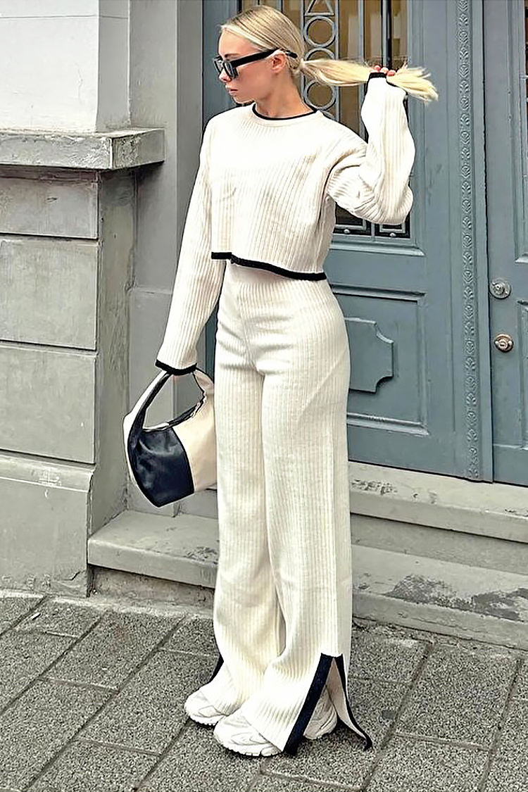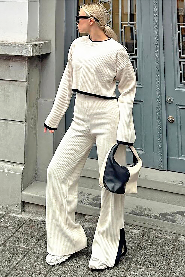 • Bluza ima udoban kroj i kratku dužinu, a pantalone imaju visok struk i široke nogavice.