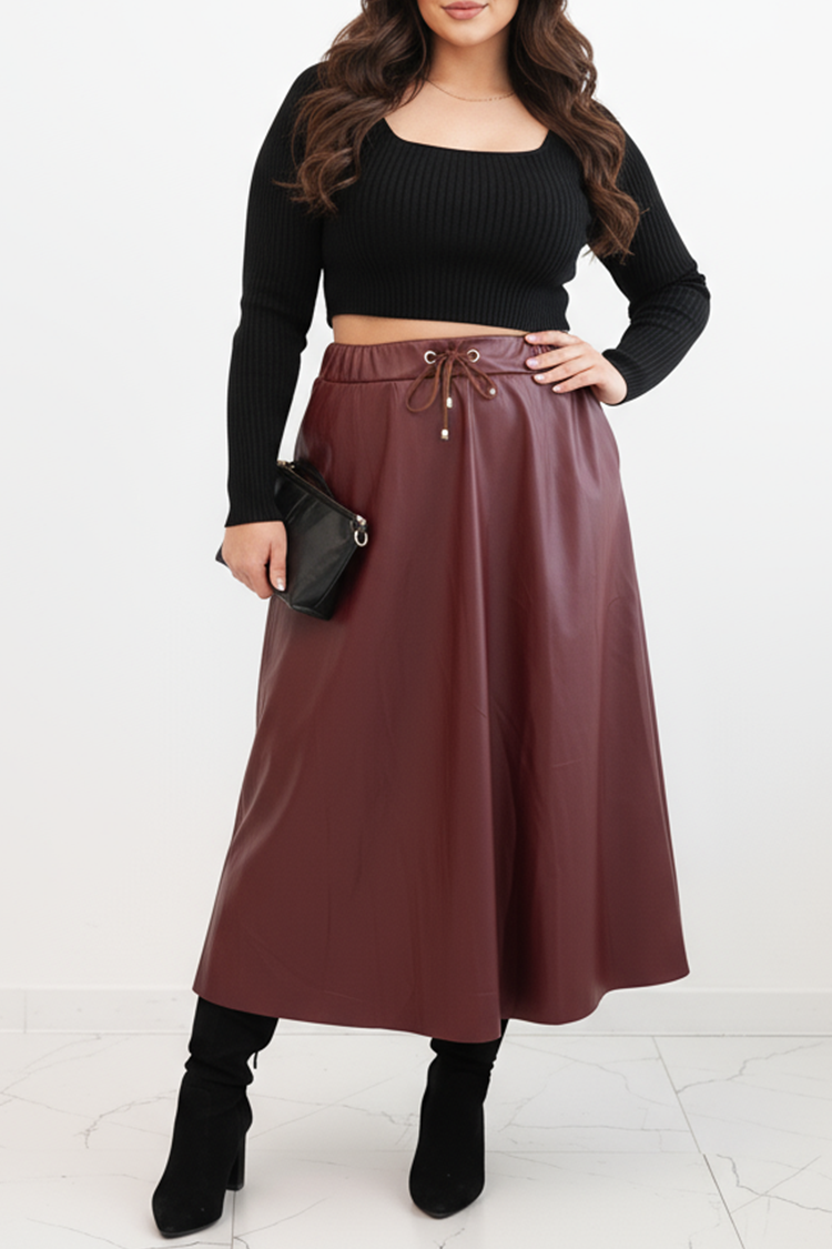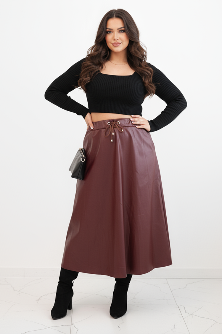 - Moderan model midi suknje od eko kože, pogodan za svakodnevno nošenje.