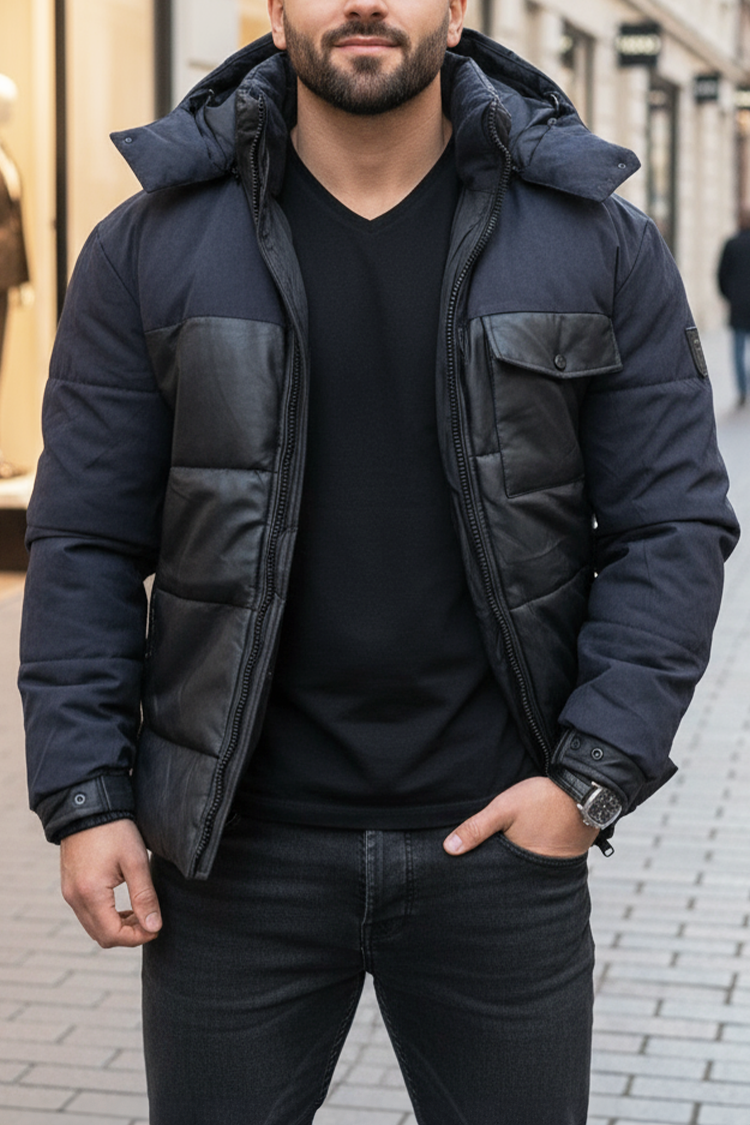 - Elegantna i moderna muška zimska jakna u crnoj boji, koja kombinuje stil i funkcionalnost.