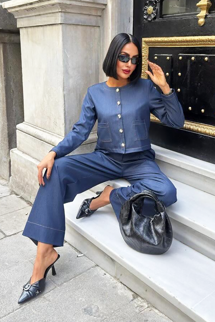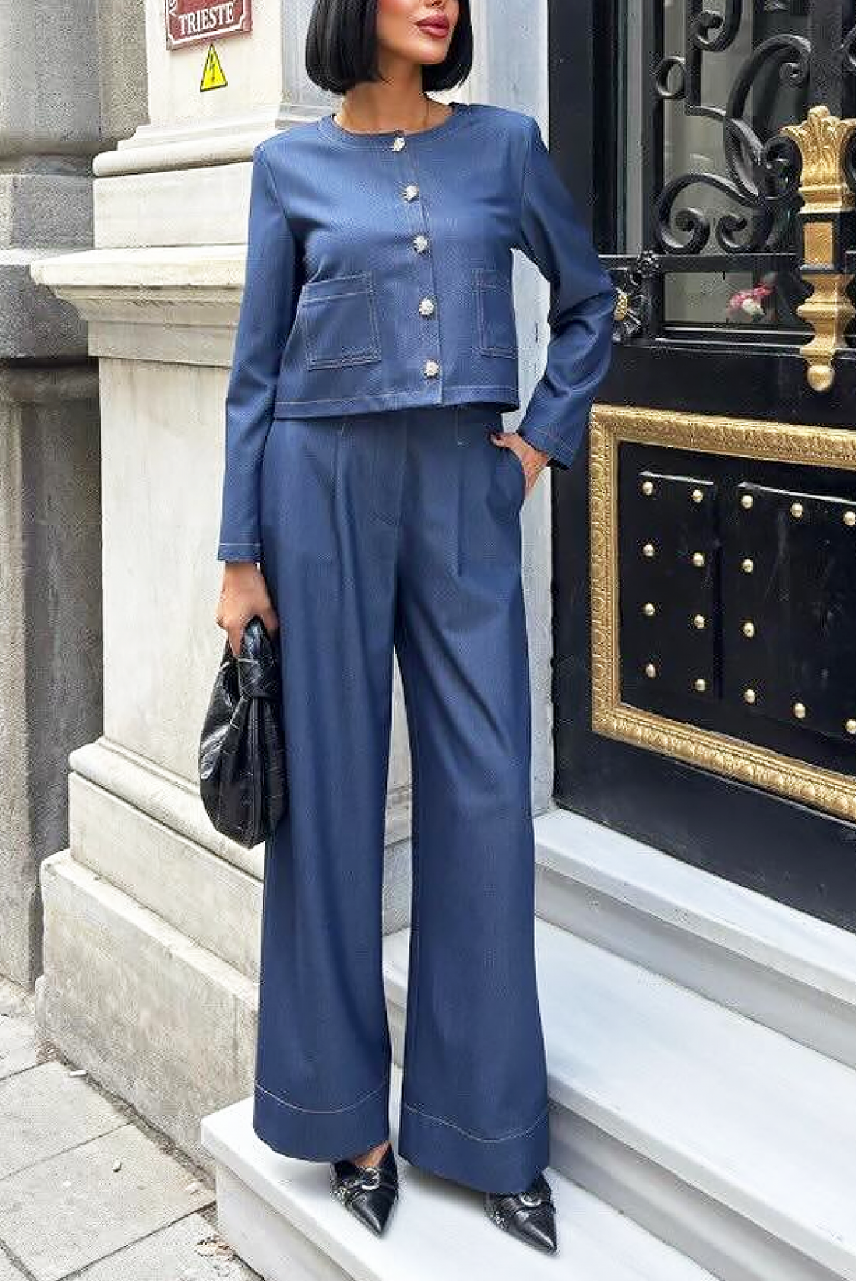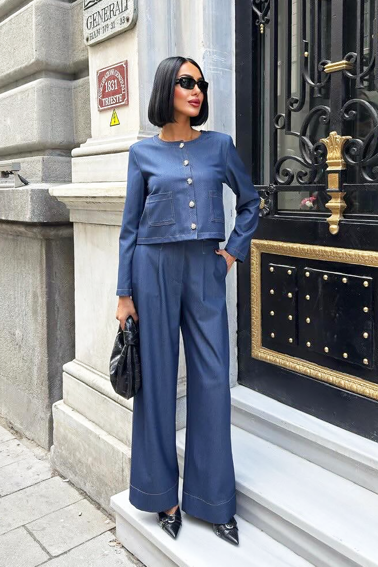 - Pantalone imaju visok struk, široke nogavice i bočne džepove.