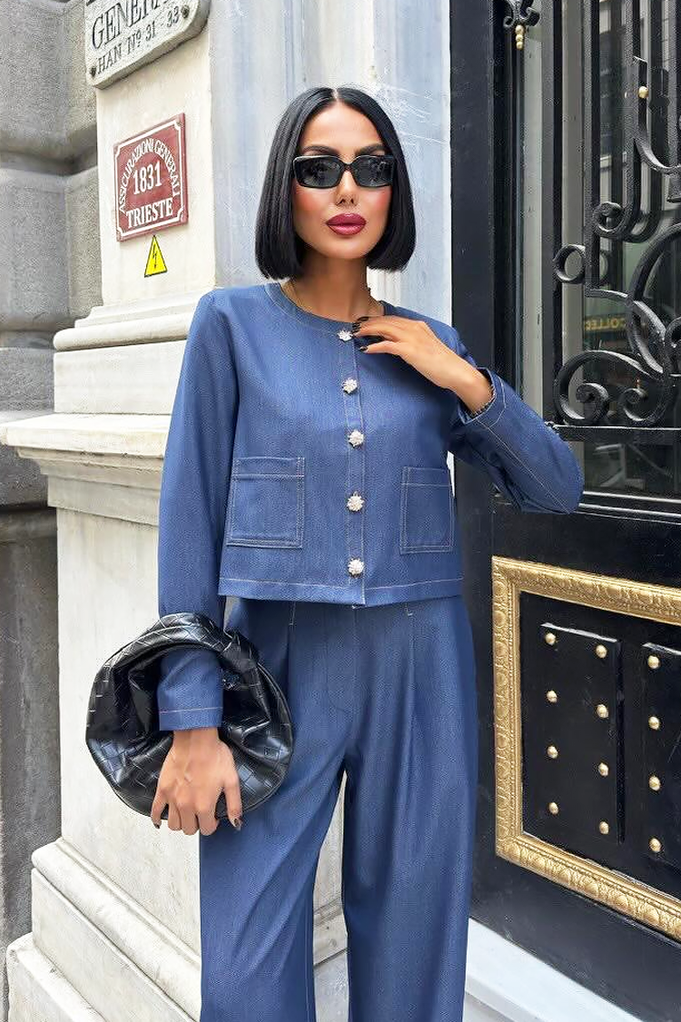 - Elegantni ženski dvodelni komplet sa jednobojnim dezenom.
