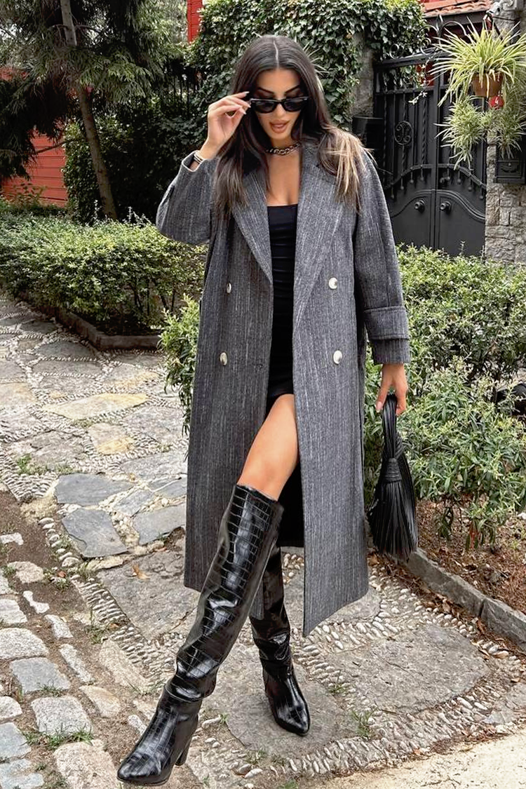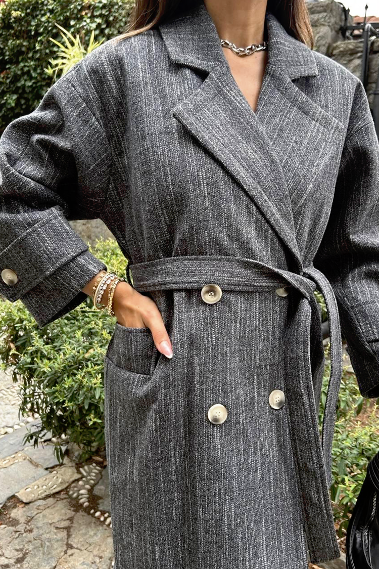 • Model ima klasičan kroj, efektne manžetne, kaiš od iste tkanine i dvoredno zakopčavanje na dugmad.