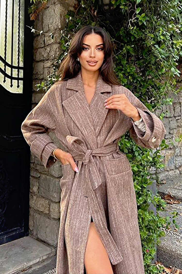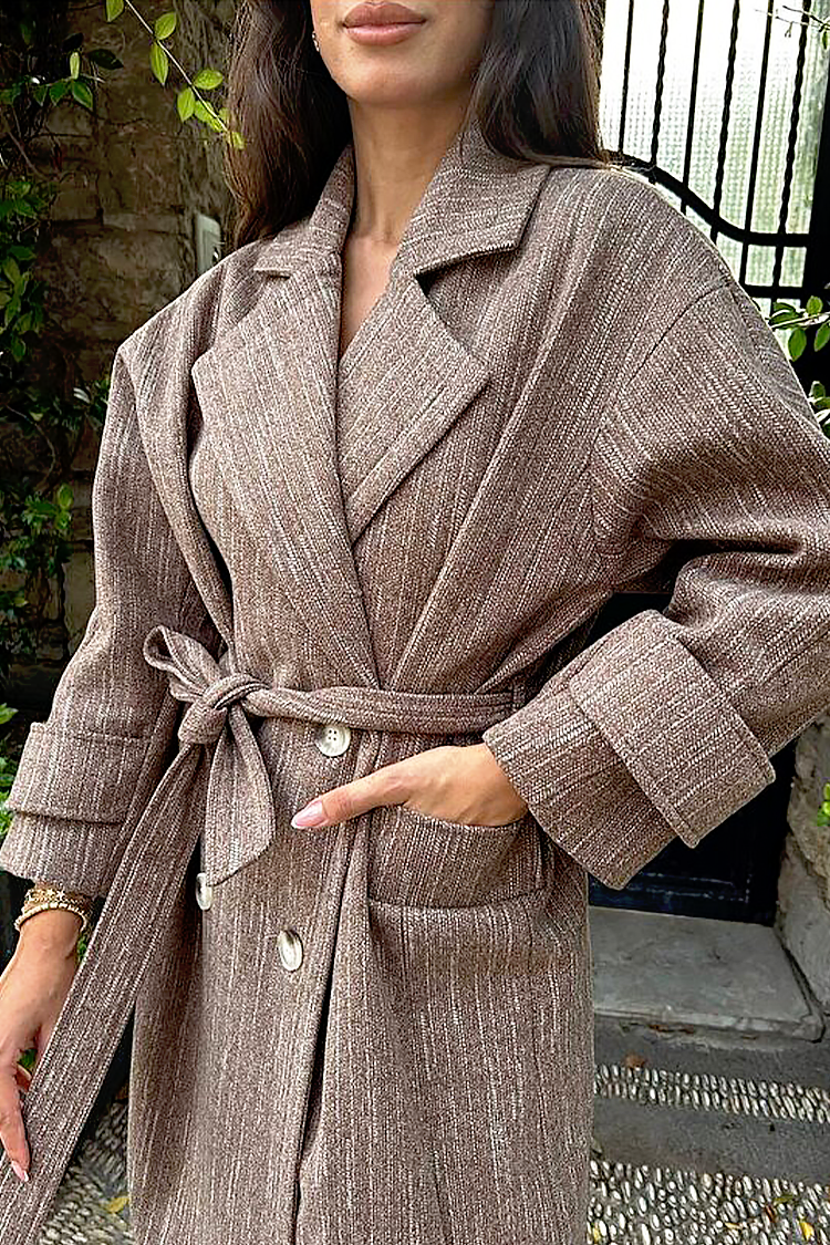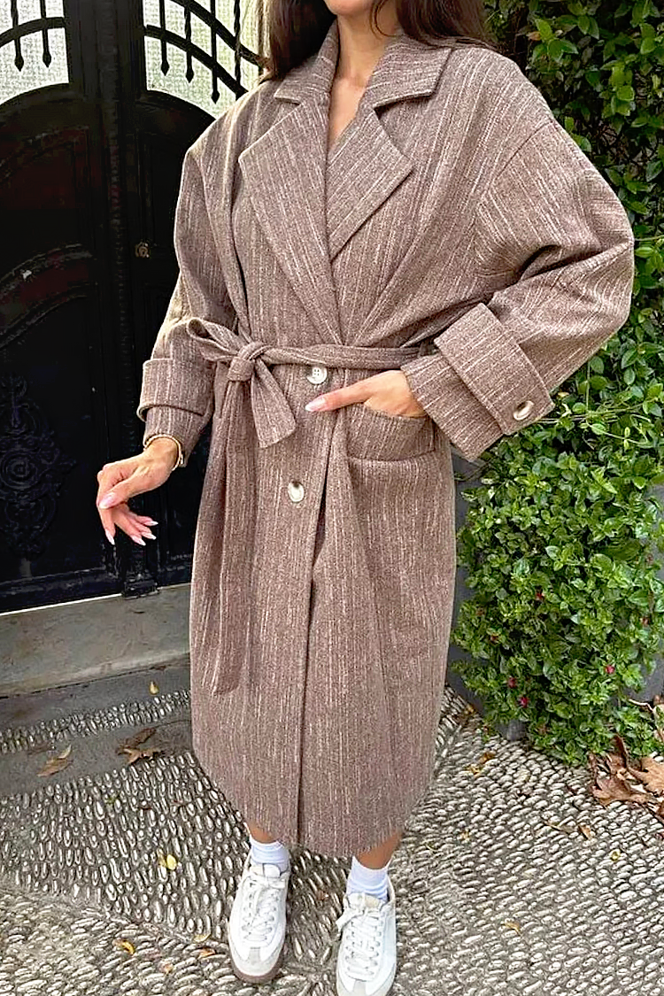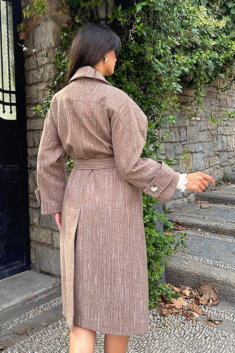 • Model ima klasičan kroj, efektne manžetne, kaiš od iste tkanine i dvoredno zakopčavanje na dugmad.