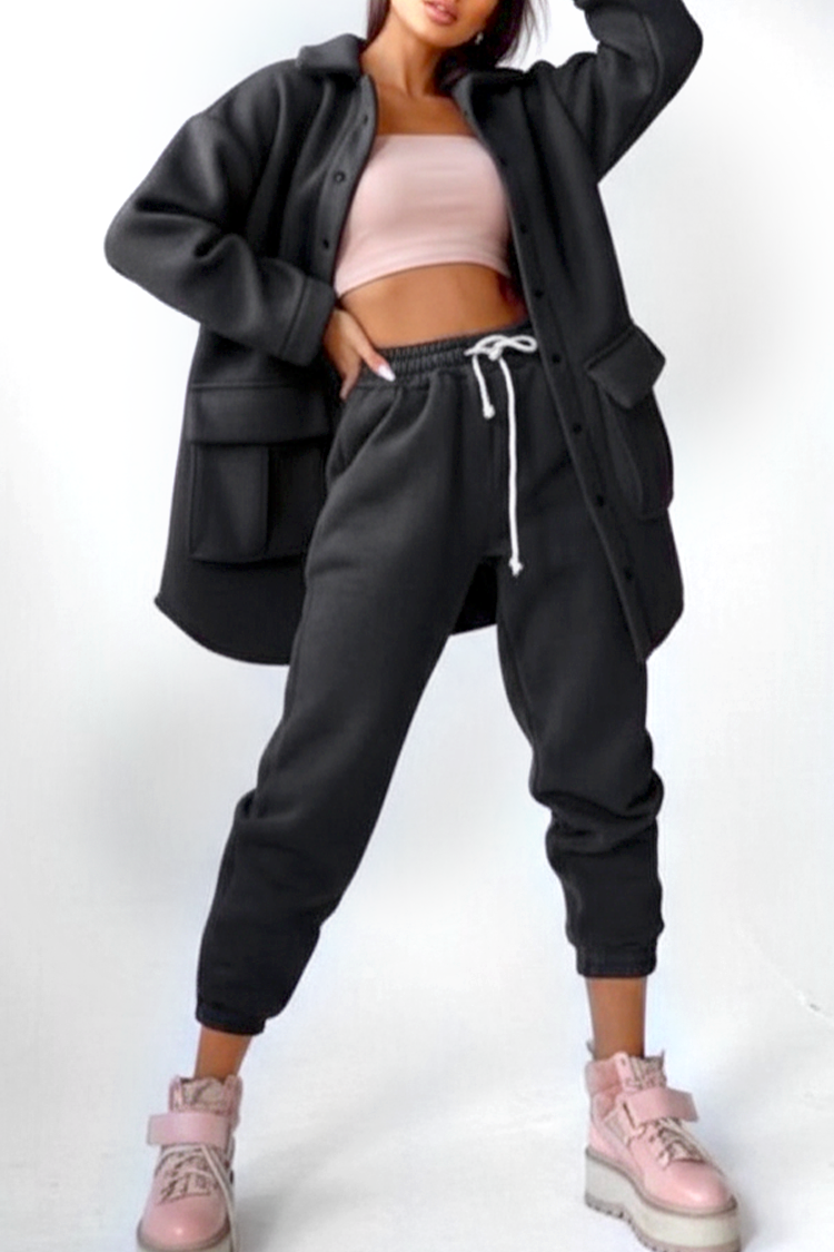 - Košulja ima sportski dizajn, dugmad i džepove, a pantalone imaju visok i elastičan struk.
