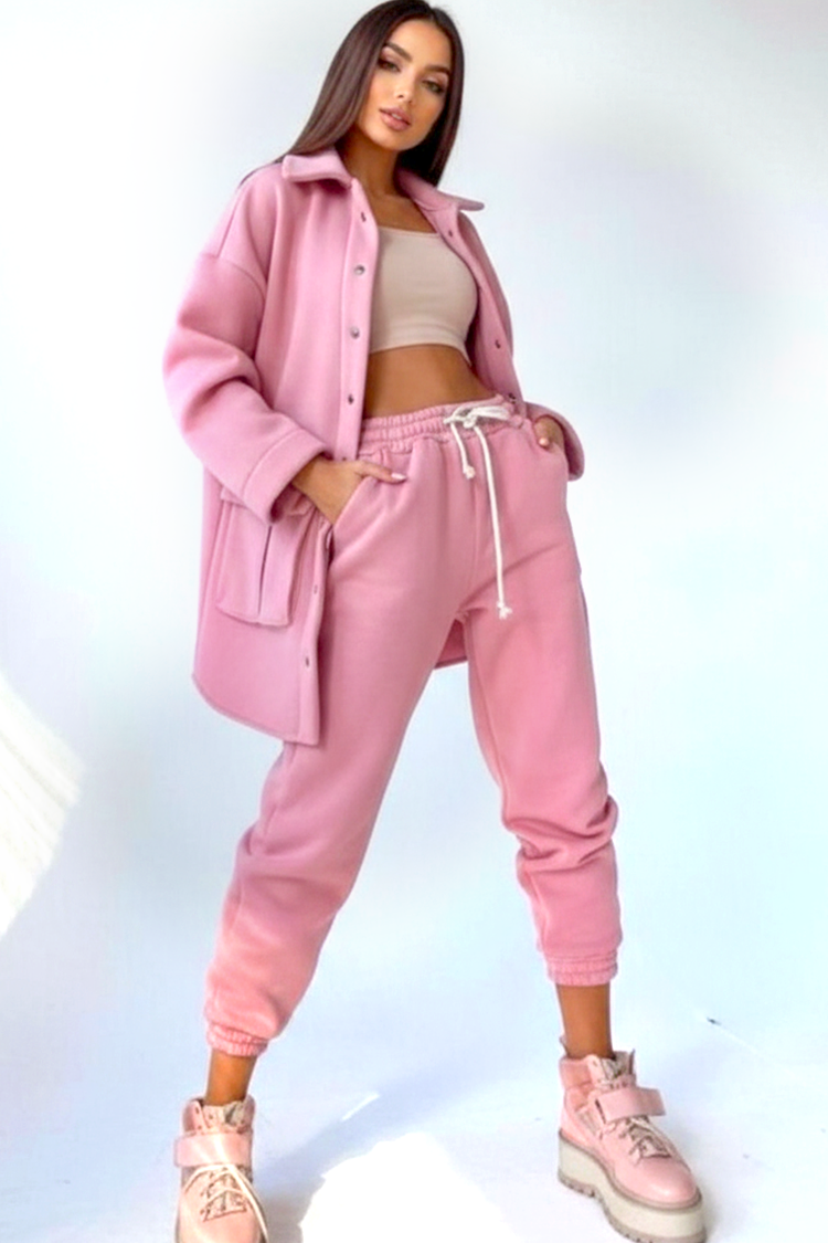 • Košulja ima sportski dizajn, dugmad i džepove, a pantalone imaju visok i elastičan struk.