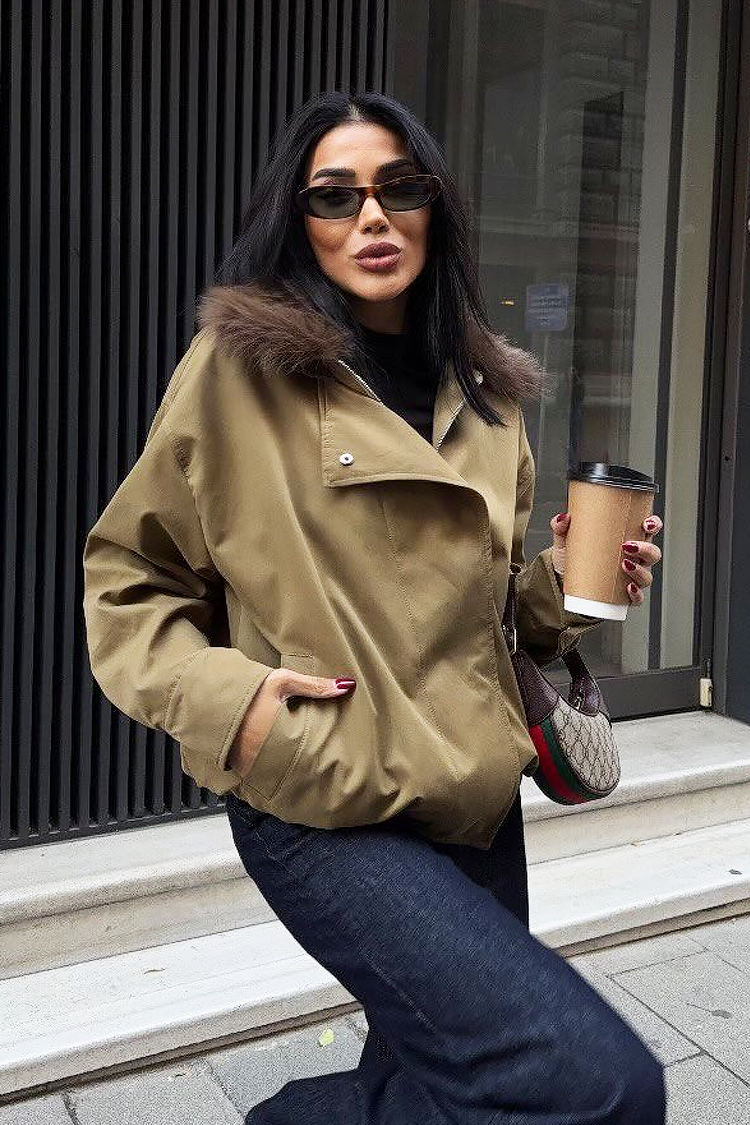 - Model ima pahuljastu kragnu, bočne džepove i zakopčavanje na rajsferšlus i dugmad napred.