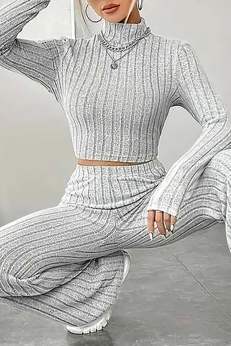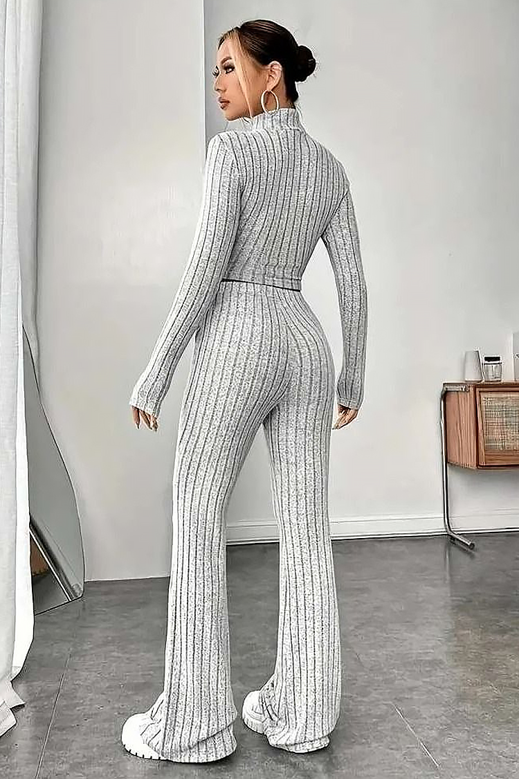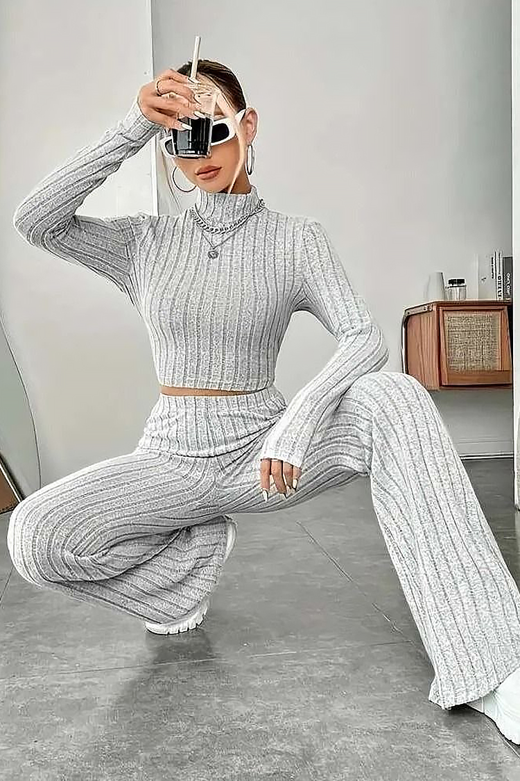 - Bluza ima udoban kroj i kratku dužinu, a pantalone imaju visok struk i široke nogavice.