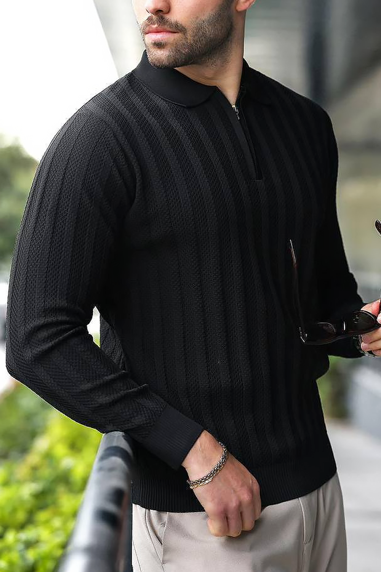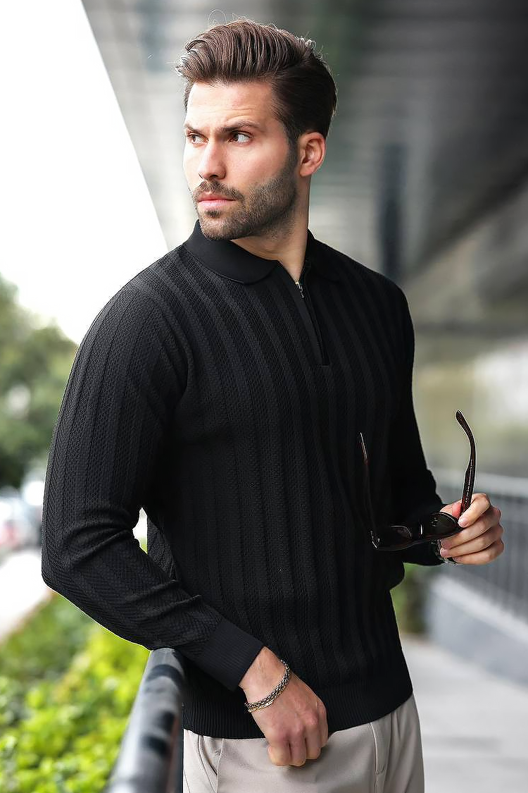 - Udoban i stilski muški džemper sa rajsferšlus kragnom i jednobojnim dezenom.