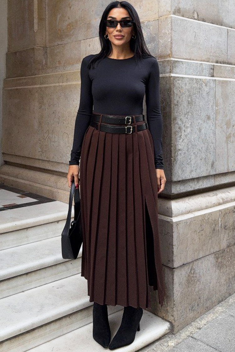 - Model ima midi dužinu, visok struk i seksi šlic. Suknja dolazi sa dva crna kaiša.