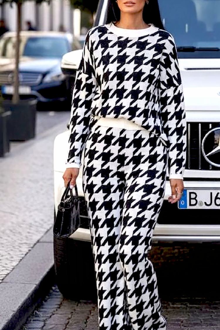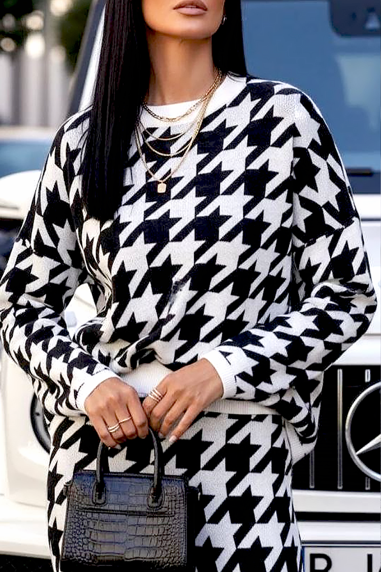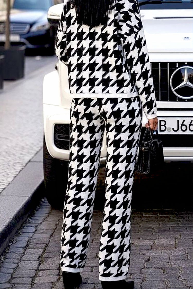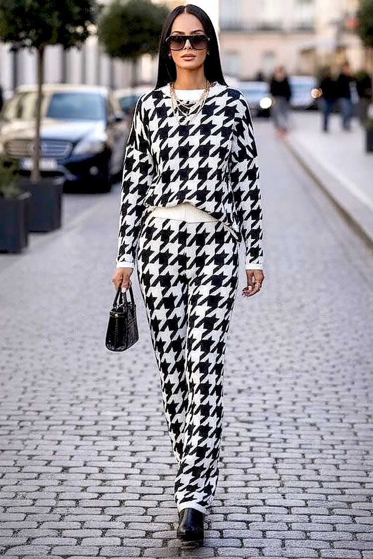- Bluza ima udoban kroj i dugačku dužinu, a pantalone imaju visok struk i široke nogavice.