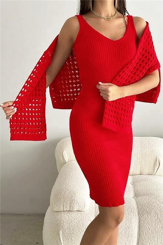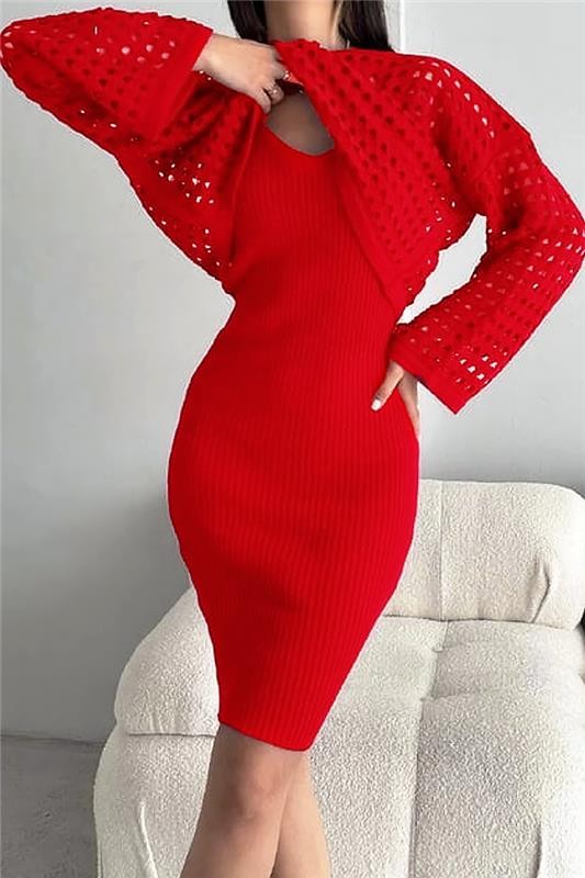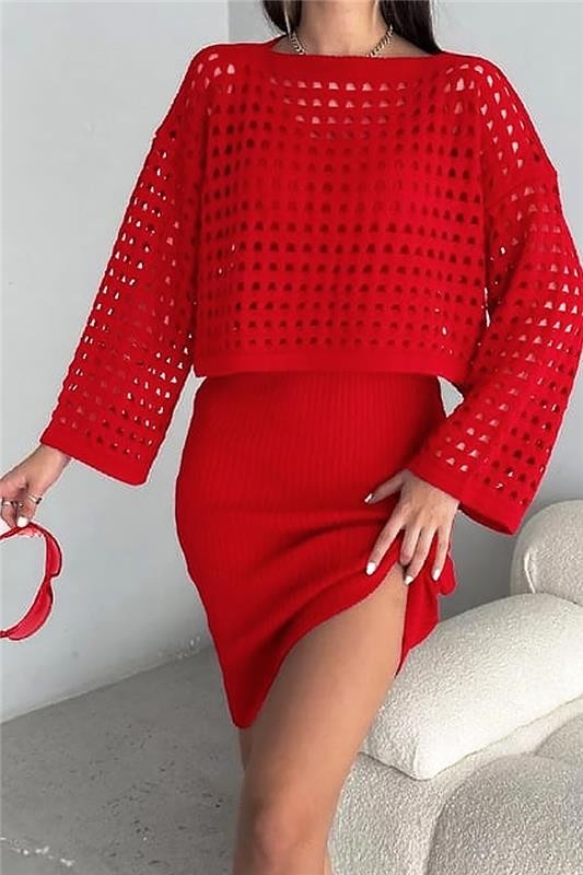 - Ženski dvodelni komplet, koji se sastoji od kratke haljine i efektnog džempera, pogodan za trendi izgled.