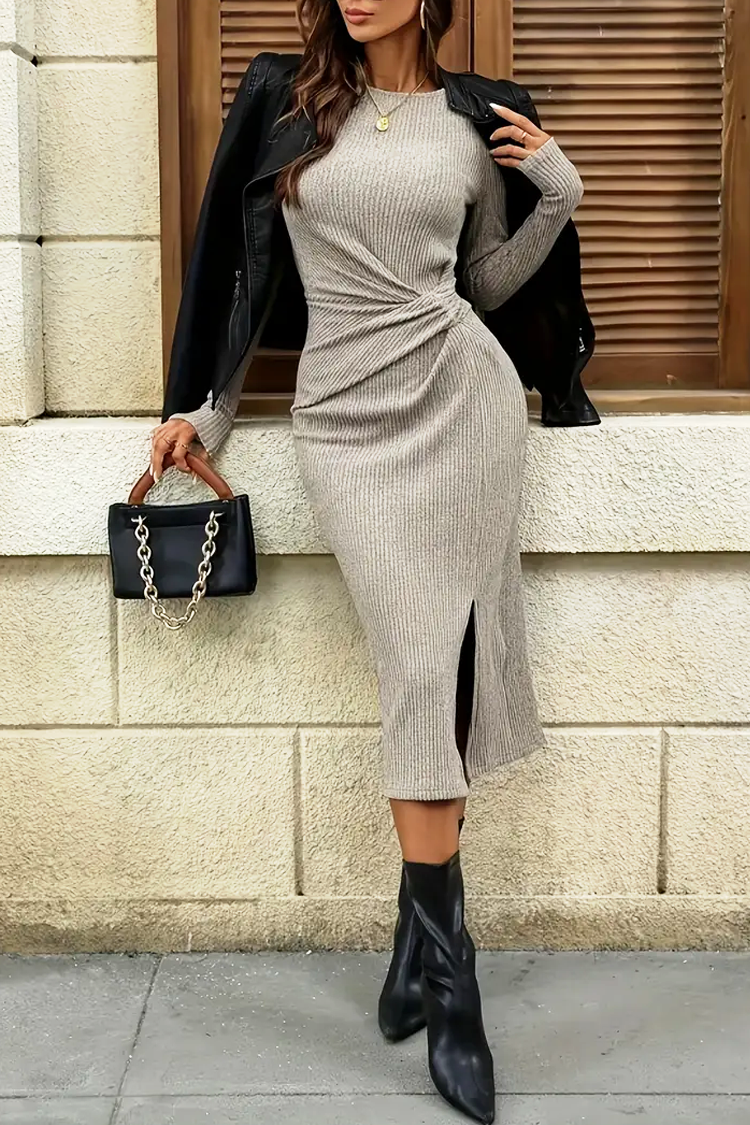 - Model ima uski kroj, efektne nabore, duge rukave i seksi šlic.