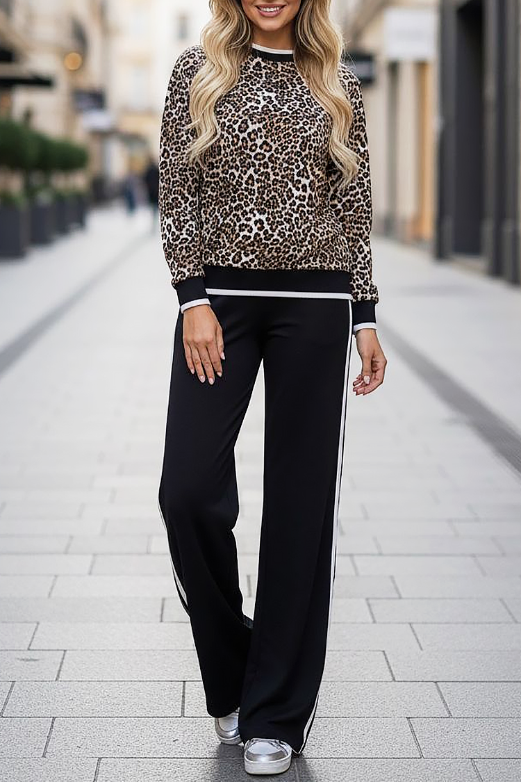 - Bluza ima slobodan kroj i okrugli dekolte. Pantalone imaju visok struk i široke nogavice.