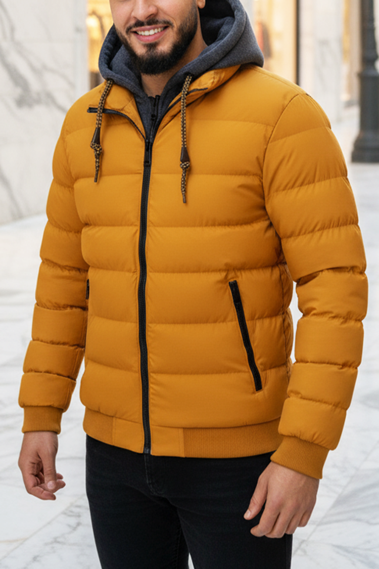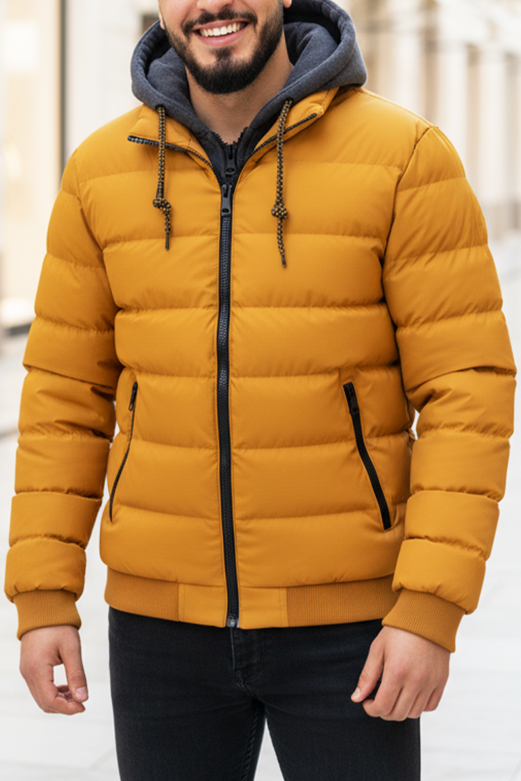 • Moderna prošivena muška jakna u boji senfa, koja kombinuje udobnost i moderan urbani dizajn.