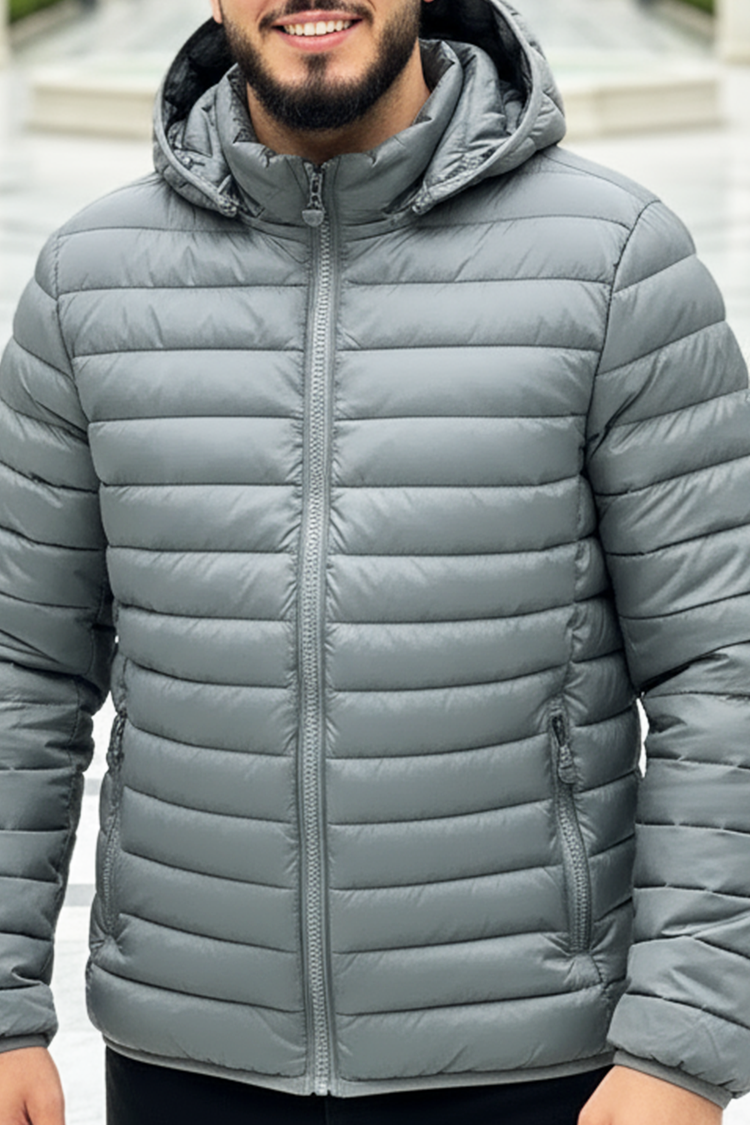 - Udobna muška jakna sa horizontalnim prošivenim dizajnom i skidivom kapuljačom u trendi boji, sportsko-svakodnevnog stila.
