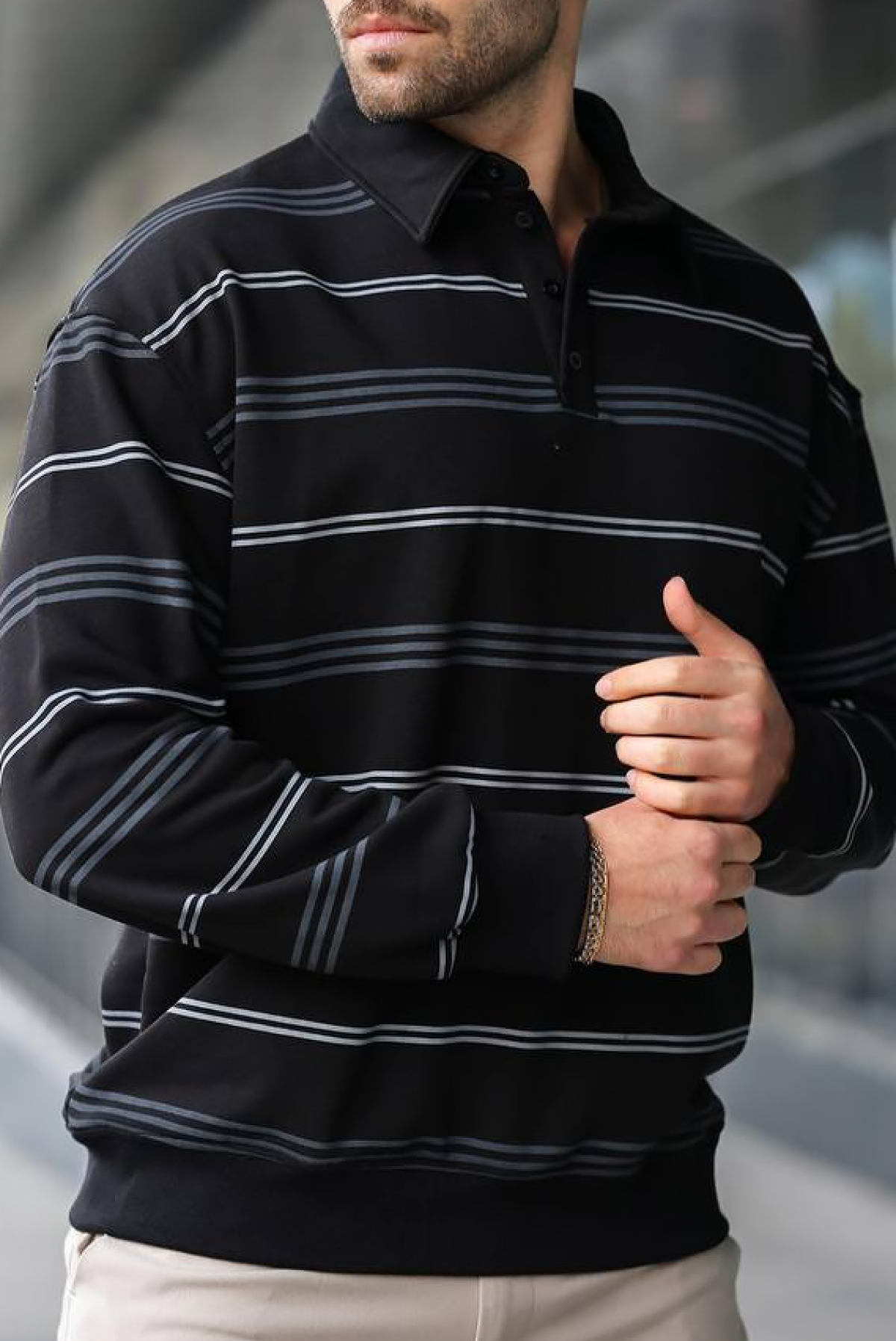 - Ležerna muška bluza sa kragnom i dekolteom na dugmad, pogodna za razne modne kombinacije.