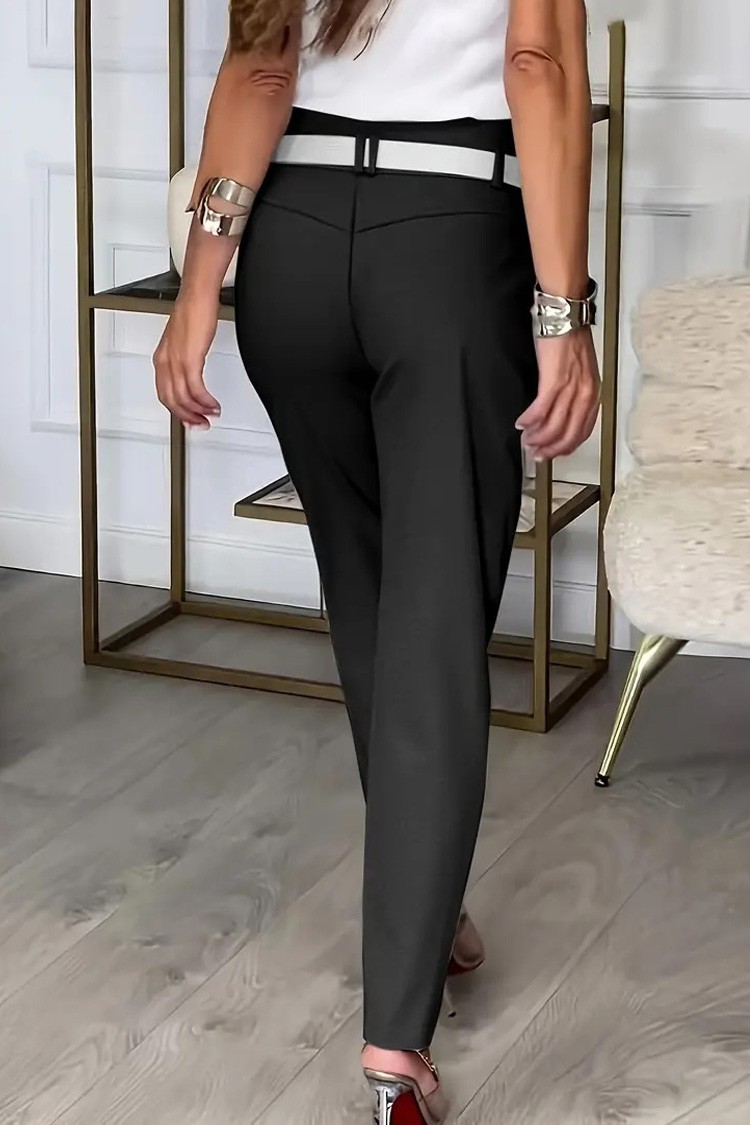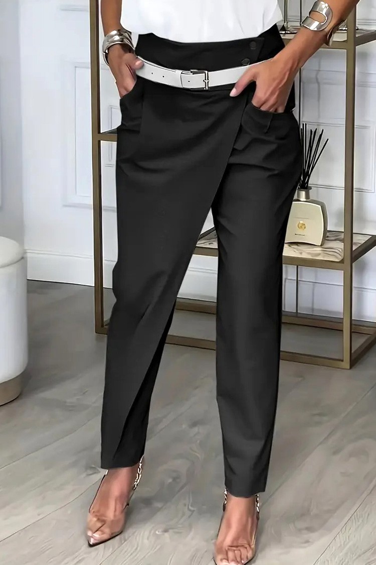 - Ženske pantalone sa visokim asimetričnim strukom i dugmadima, pogodne za svakodnevni život i kancelariju.