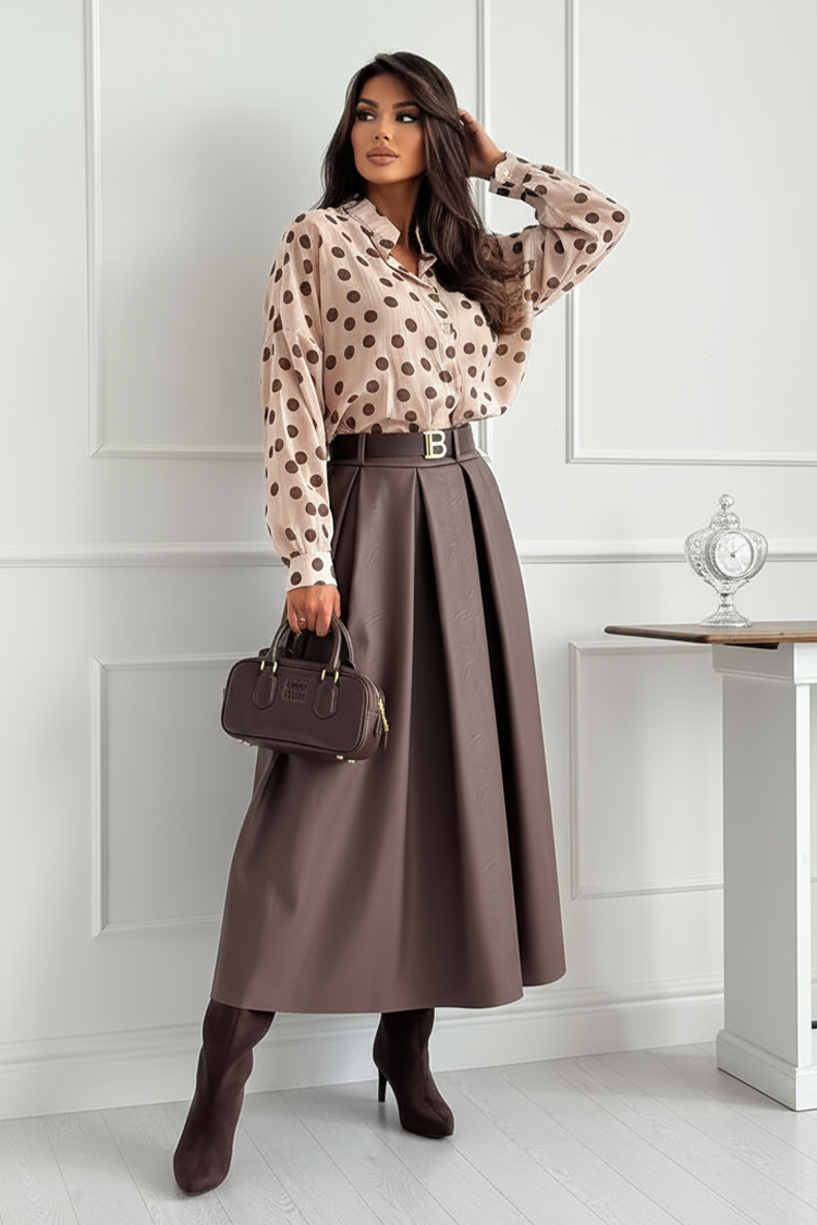- Model ima midi dužinu, visok struk i širok kroj. Dolazi sa kaišem sa efektnom kopčom.
