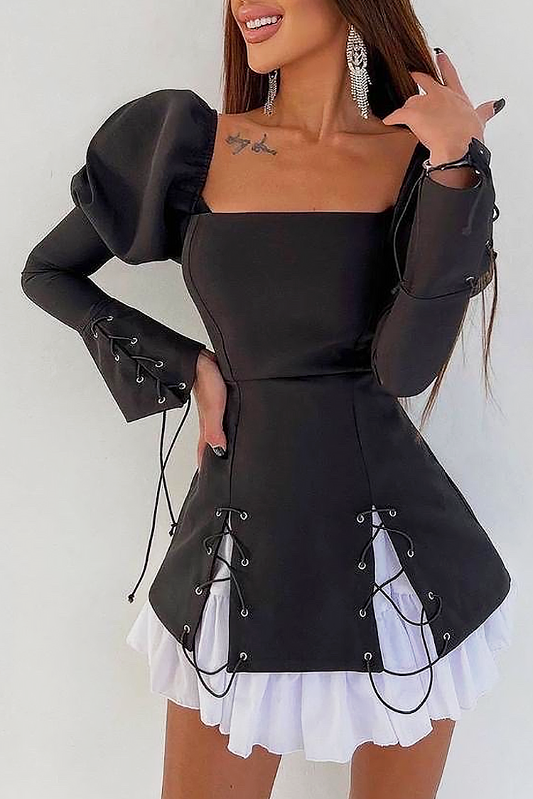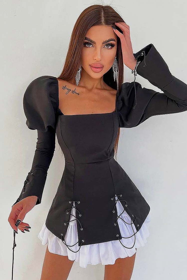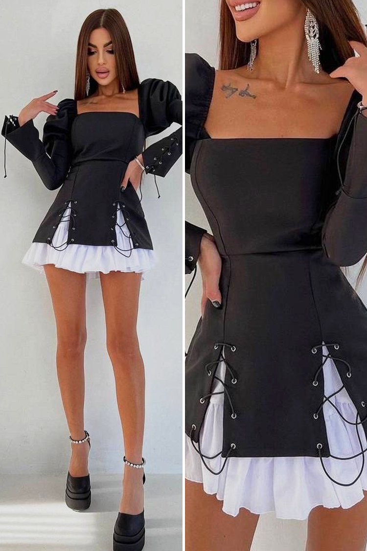 - Haljina ima seksi dizajn, kvadratni dekolte i duge, efektne rukave.