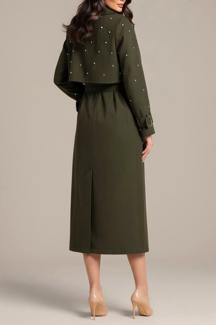 - Model ima klasičan kroj, kaiš i manžetne sa kopčom, ukrasne bisere i akcentnu ružu na kragni.