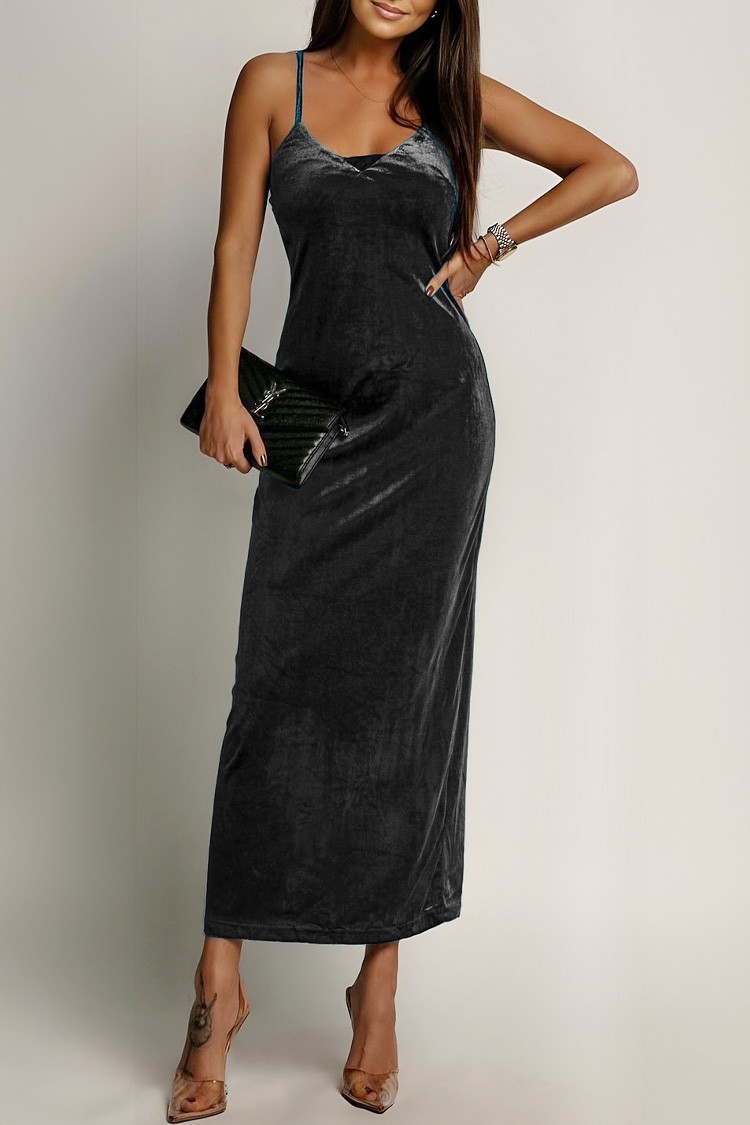 - Haljina ima uski kroj, tanke bretele i dugačku dužinu.
