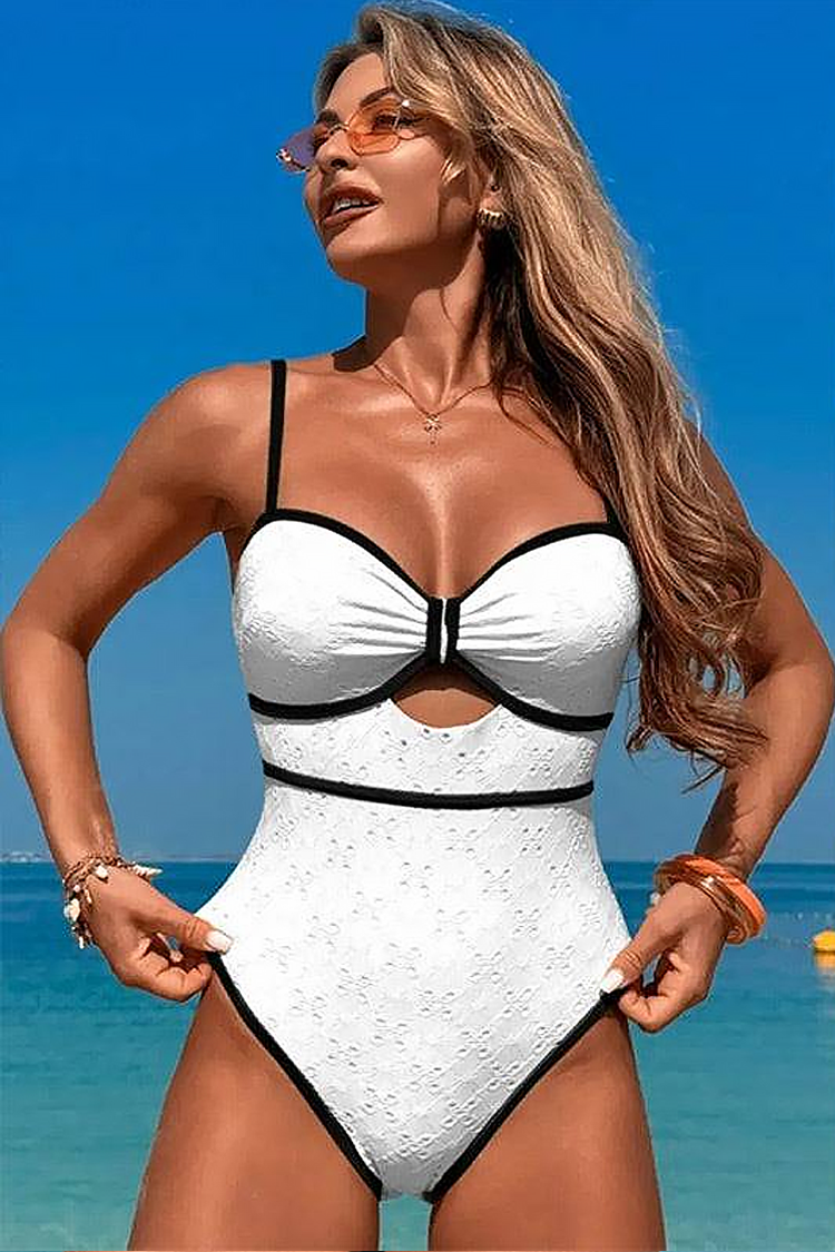 - Jednodelni kupaći kostim u dvobojnom dezenu, pogodan za odmor na plaži i u spa centru.