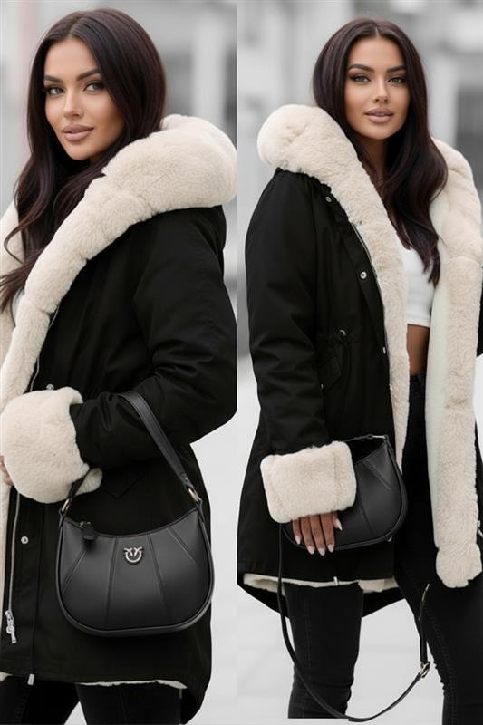 - Model ima udoban kroj, zakopčavanje na dugmad i rajsferšlus, voluminoznu kapuljaču sa perjem i manžetnama.
